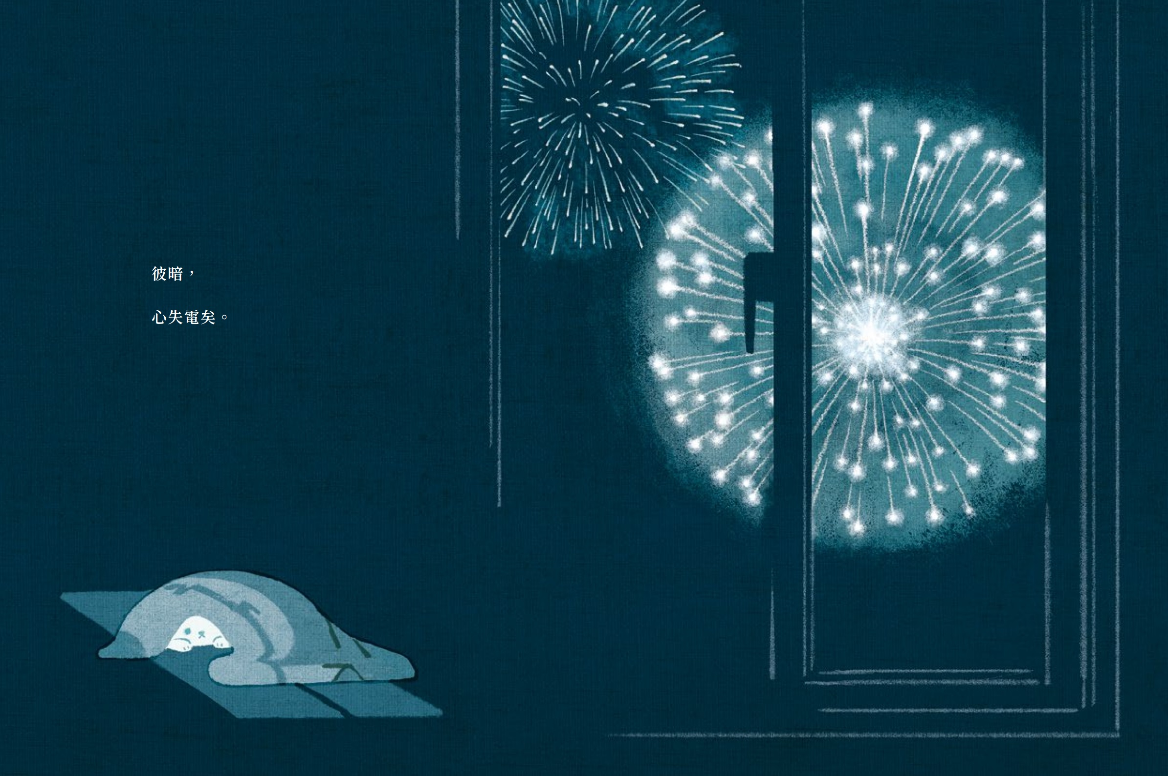 窗外熱鬧的煙火和漆黑的室內空間對比,帶出了瞬間的無力與失重感。