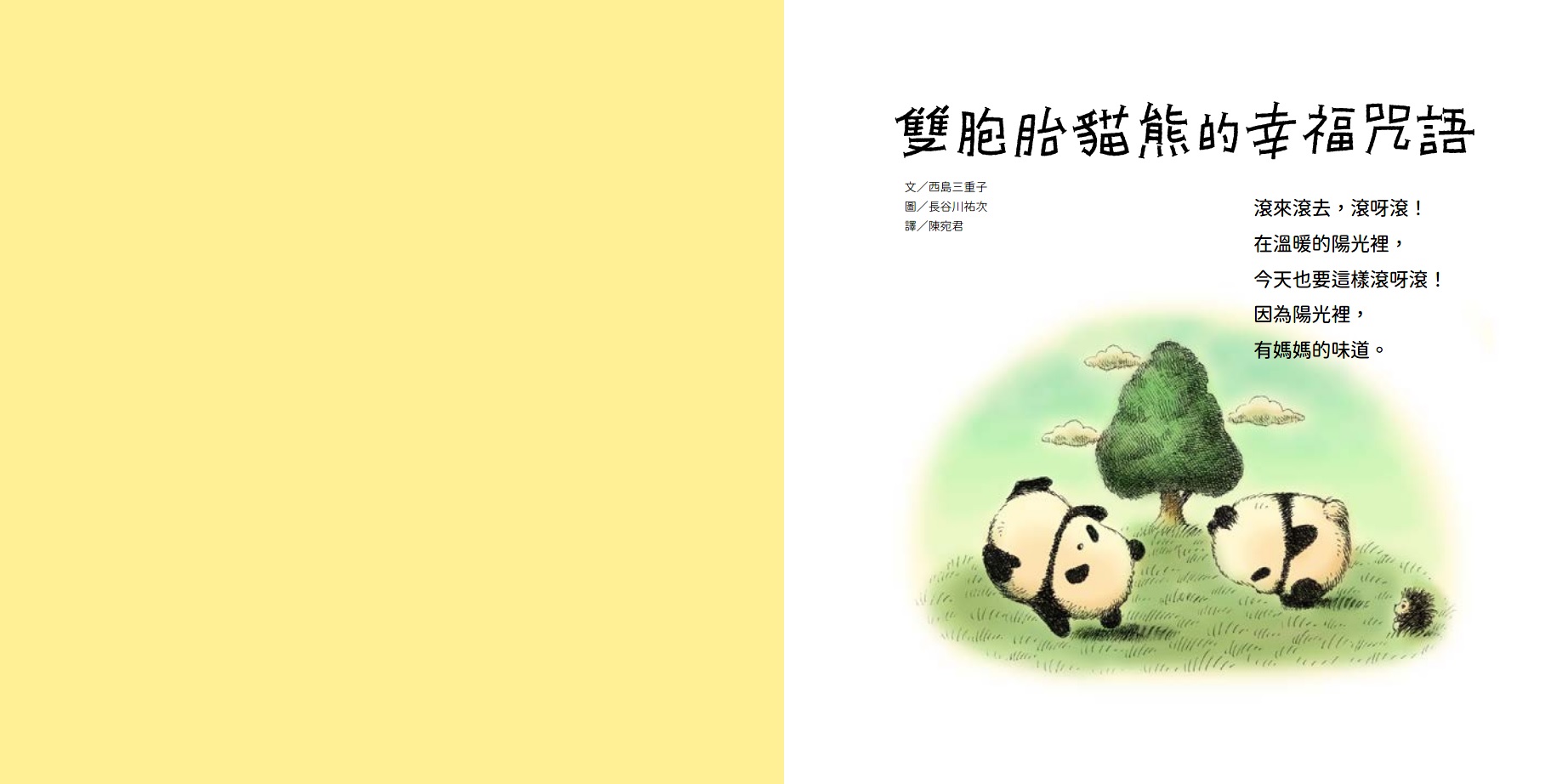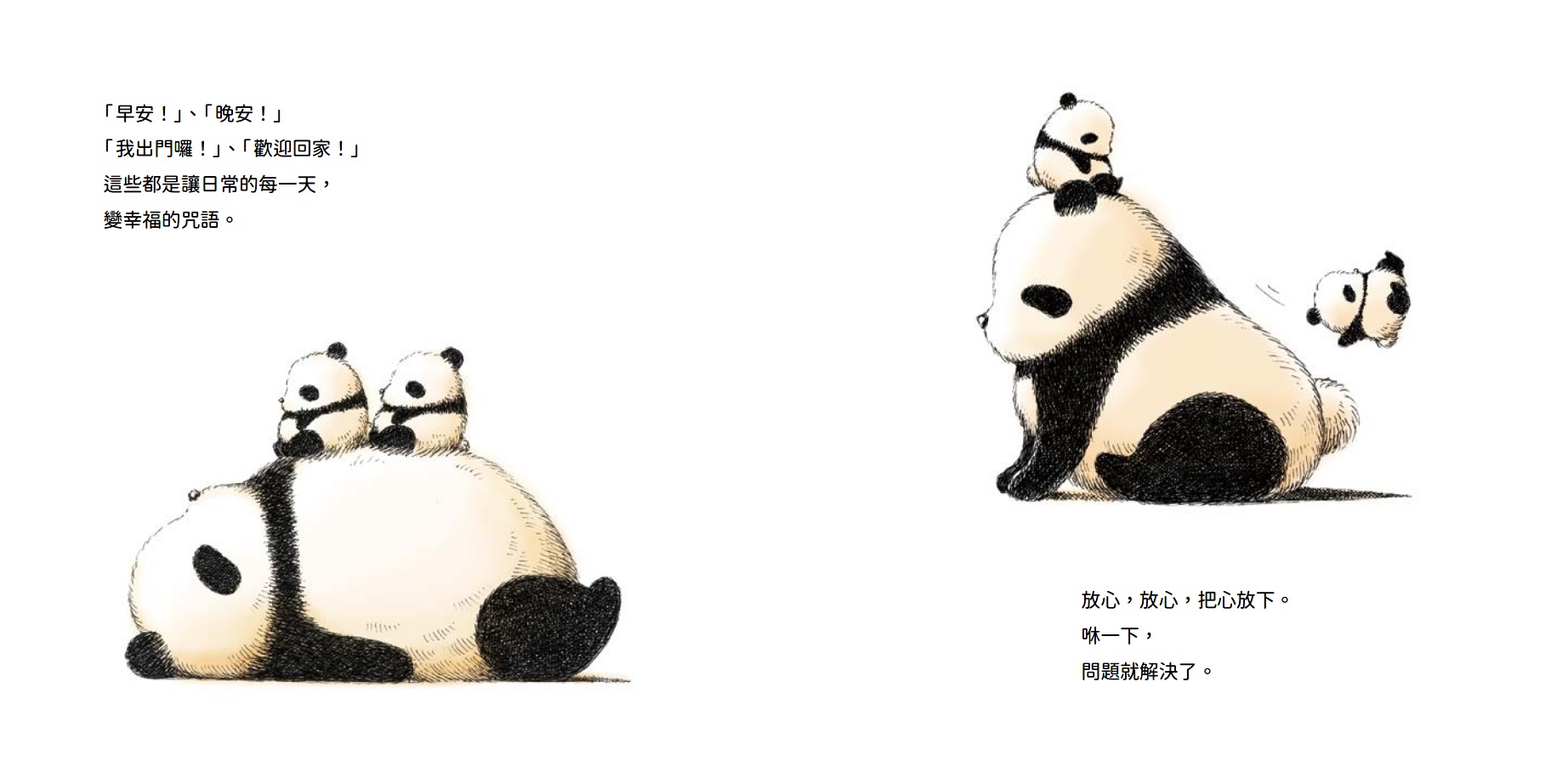 音樂人西島三重子用詩意且具有音樂性的文字表達,搭配插畫家長谷川祐次用柔軟、細膩的筆觸繪製的貓熊圖像。畫面甜蜜,傳遞了人與人之間的甜蜜的情感,引領讀者找到屬於自己的幸福咒語。