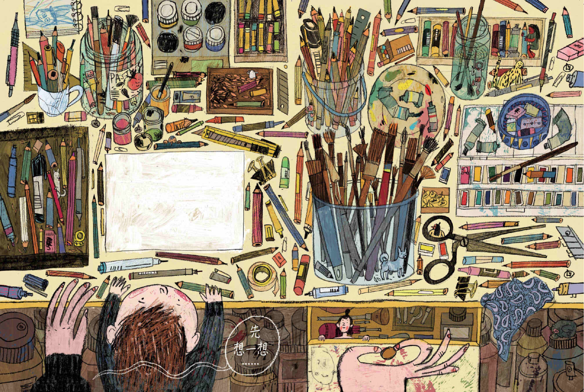 看到桌上滿滿的美術材料,孩子總是會等不及在空白的圖畫紙上塗鴉。