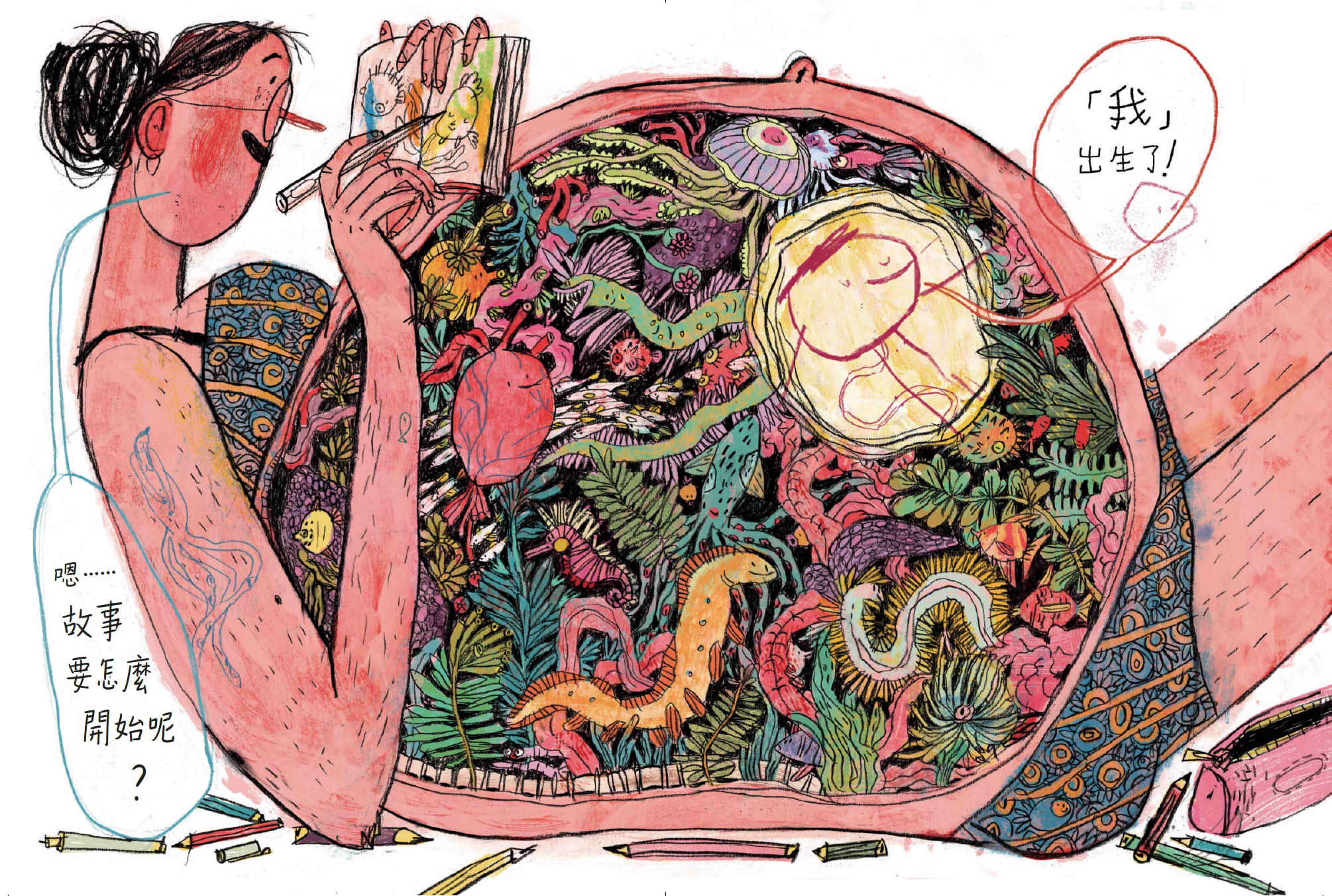 故事的開篇母親巨大的形象清晰可見,但隨著每一頁的展開,當孩子在自己的人生道路闖關,母親似乎逐漸縮小融入孩子創作的畫面中,也從主動照顧和引導,轉為故事裡的配角。 如果你仔細觀察,每一頁母親都變身成不同的角色,有時是織毛衣的美人魚,有時則是洗衣服的人馬,不時還彎腰收拾殘局。但有時媽媽也會變成噴火龍,有時也會累倒,不過總是陪在孩子身後,引發人思考母親角色定位與努力。