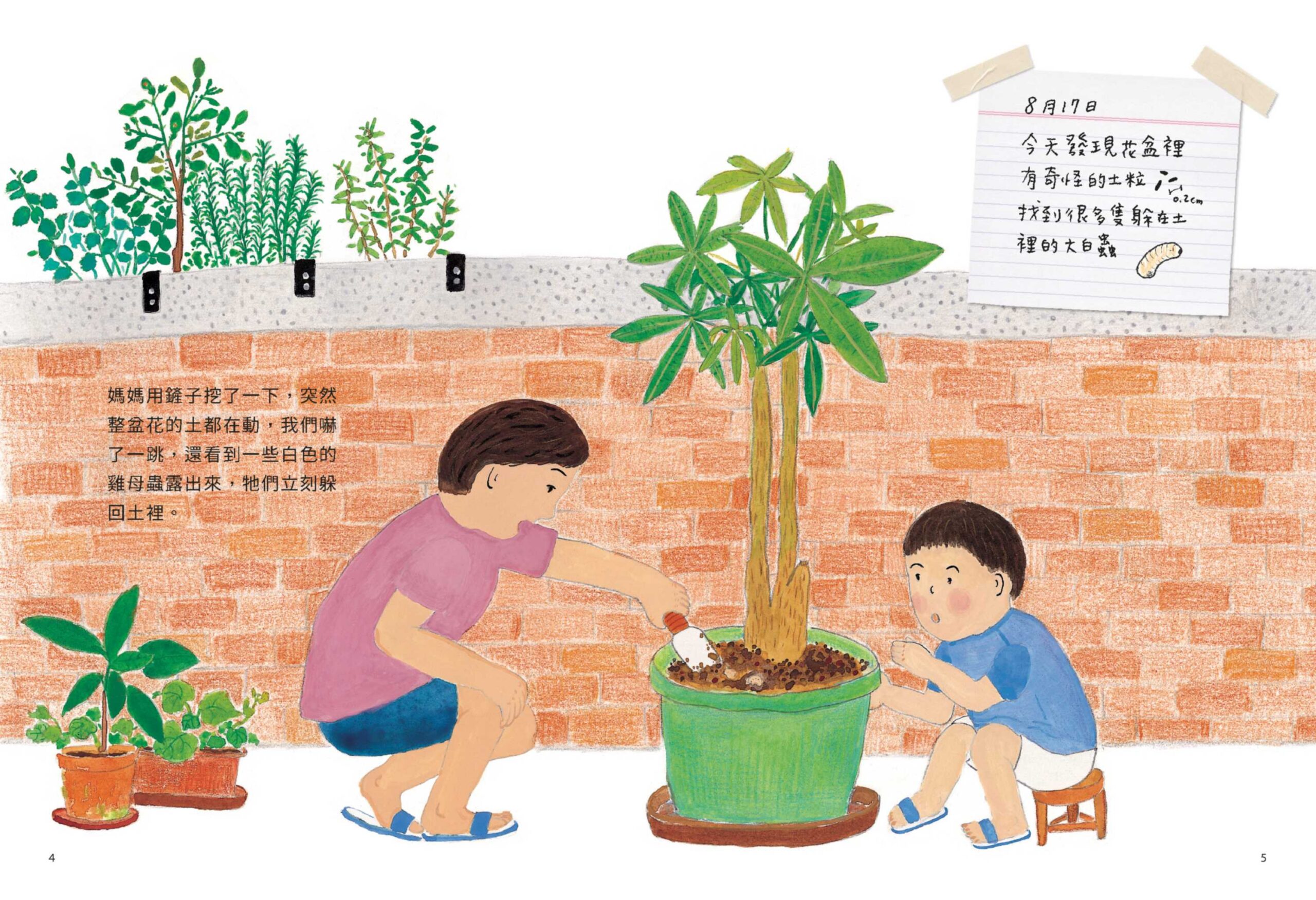 媽媽在花園裡澆花的時候,我們發現花盆裡的土在動,仔細一看,那些土就像形狀整齊的、細細的巧克力粉末,媽媽用鏟子挖了一下,結果有一些白色的雞母蟲露出來!哇,陽臺的花盆裡有雞母蟲,長大會變成怎樣的甲蟲呢,我們決定養牠們來一探究竟……