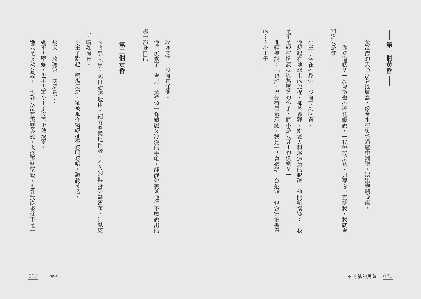 在《不將就的勇氣》中,她寫下自實務經驗提煉出的探索、臣服、對抗、轉化四階段,細密交織訪談個案故事、友人和專業人士的討論、自身經驗,書寫因深植社會、家庭的價值觀而陷入困境、覺察問題,再奮起擺脫世俗的枷鎖,成就/找回自我的故事。
