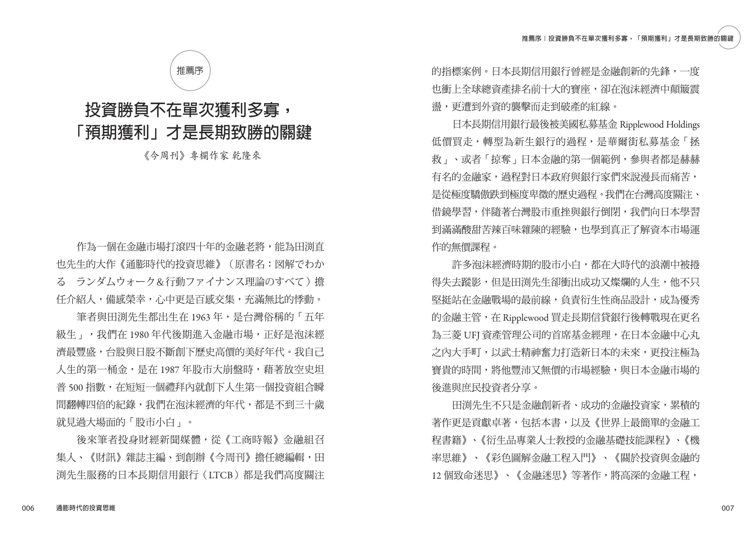 筆者非常高興聯經出版社能夠將田渕先生的大作翻譯成中文,將他在金融市場四十年所精煉出來的心得,與台灣的讀者們分享。不到300頁的文字與圖表長短合宜,如同他書中對投資朋友們的建議,要熟悉掌握經典投資理論,找出金融市場的定律,將投資理論「內化」,經由不斷積累的努力,最終找到屬於自己的投資哲學,才能體會成功的美好。他也提醒讀者,投資哲學沒有「完美」的境界,而是我們每個人在深奧又富有魅力的市場中,永無止境的追尋。