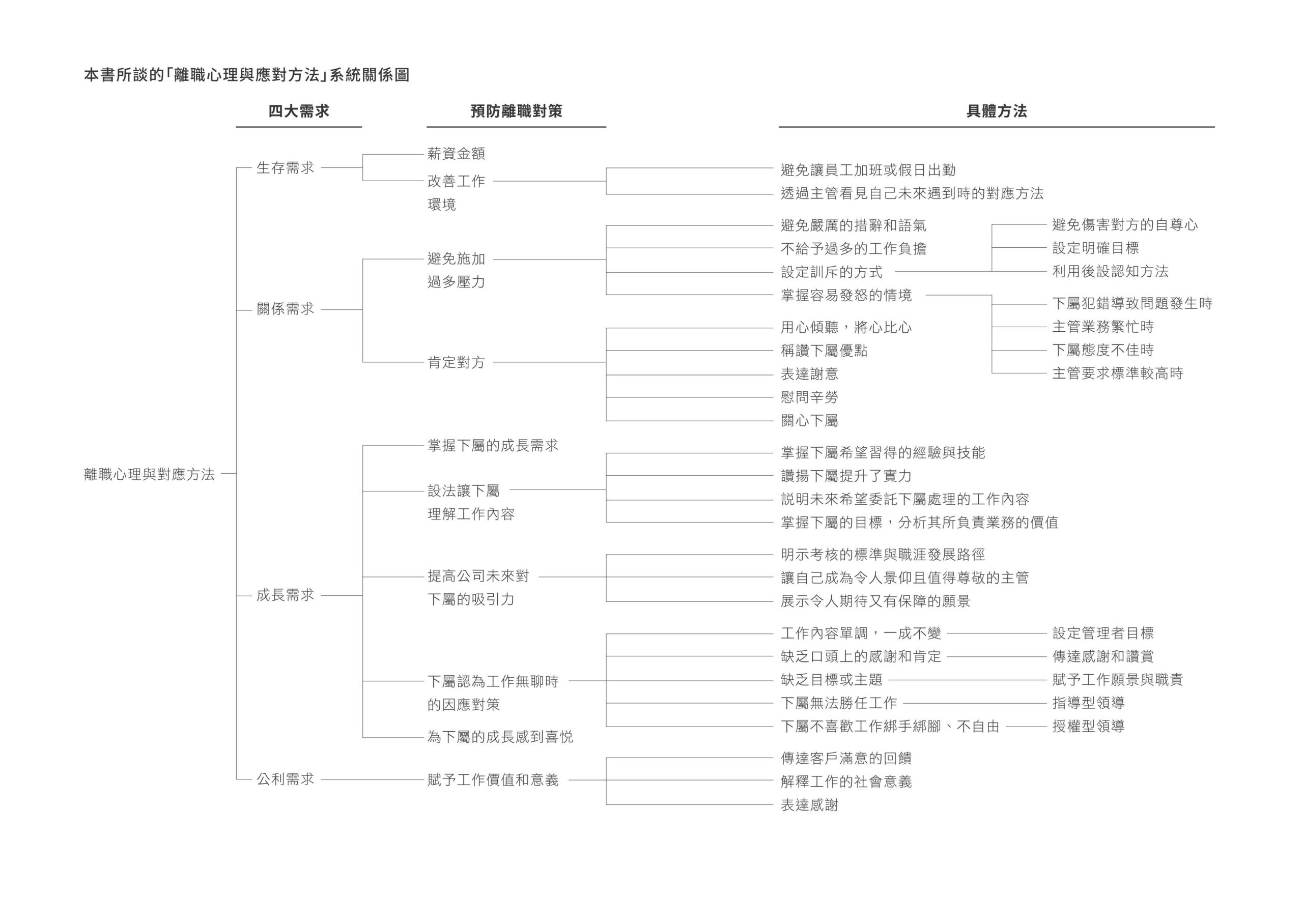 從這些經驗中我了解到,要預防離職,必須從「人類與生俱來的四種需求」,來滿足下屬(員工)的所需。員工對公司或下屬對主管,都抱有各種不同的需求。當這些需求無法被滿足,且當事人相信未來也無法獲得滿足時,就會決定離職。