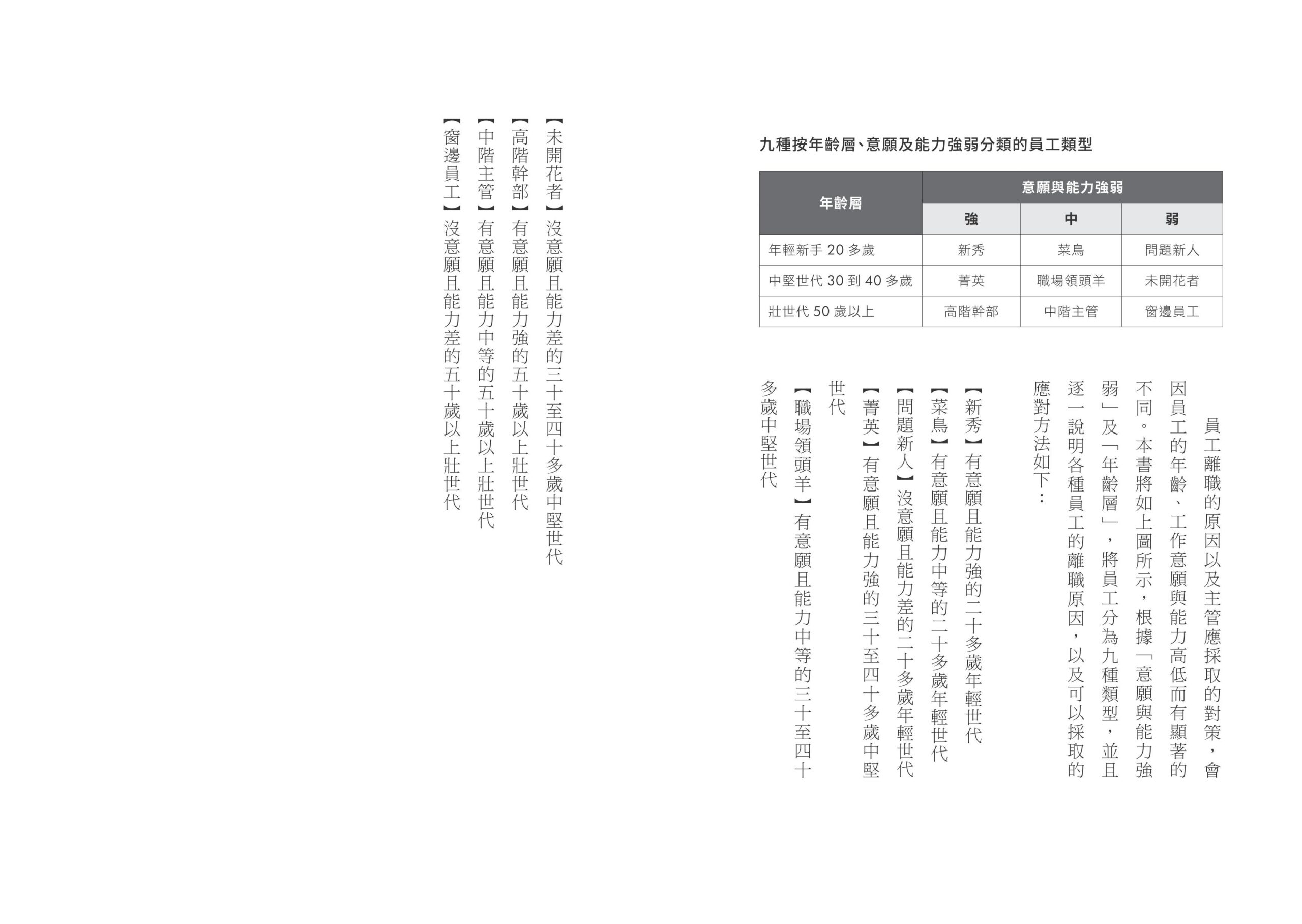 此外,這些需求會隨著下屬的年齡、意願及能力而有所不同。所以,我按照年齡別、意願及能力別,將下屬分成九種類型,並針對每種類型分析離職的心理因素和對應方法。
