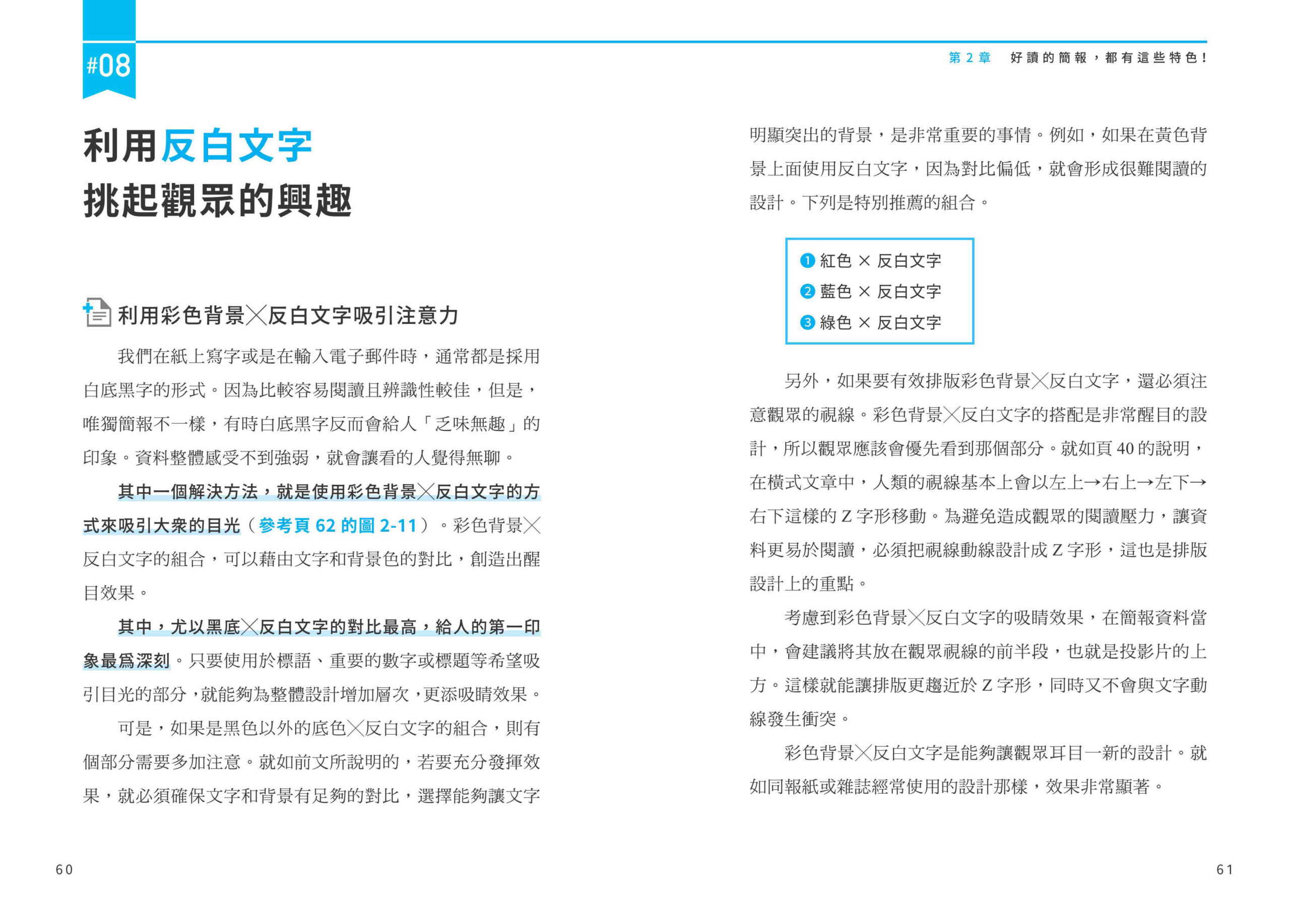 包括版面配置、色彩運用、圖表、圖解及照片等,都附有詳細解說,方便套用。