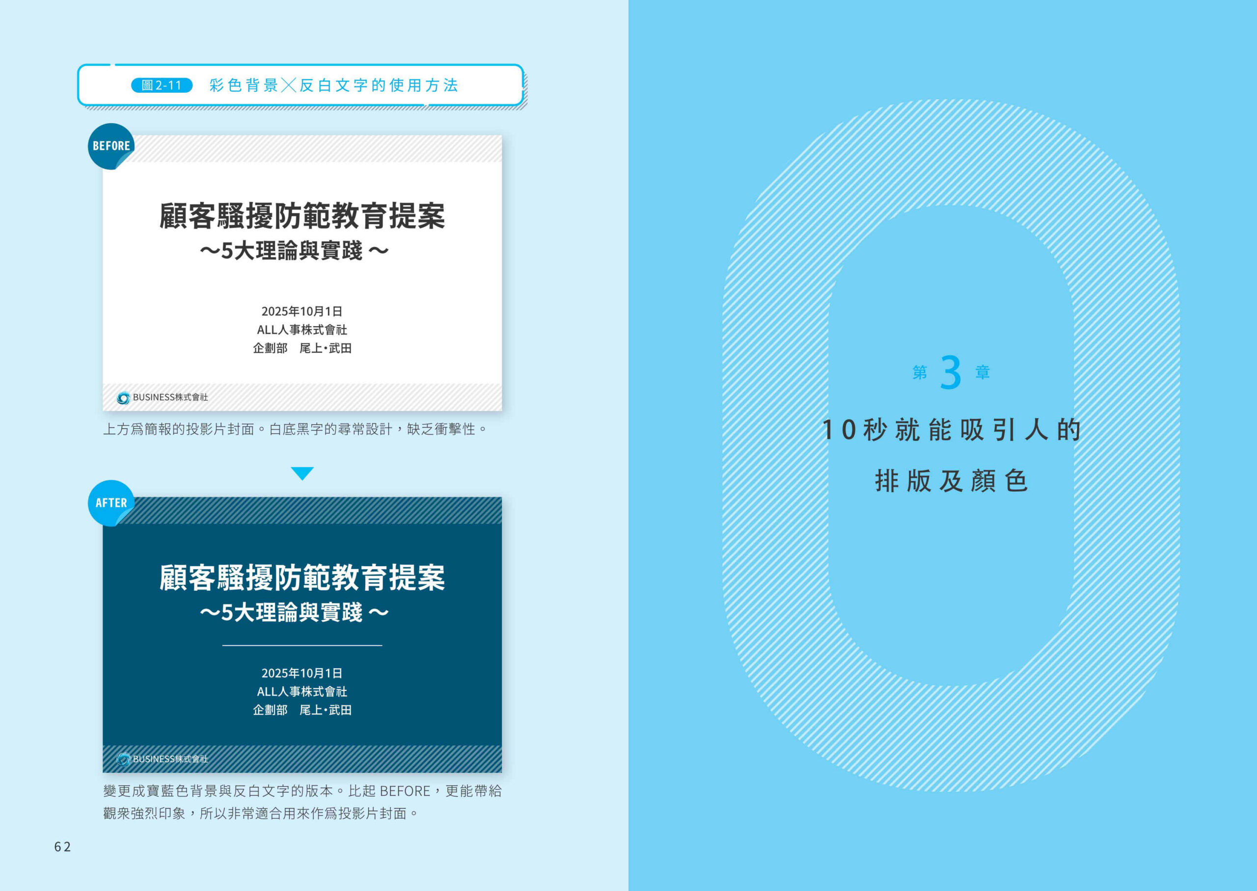 由於簡報的製作範例都是以BEFORE&AFTER的形式呈現,所以應該能夠更直觀地理解,更新原有的設計,使資料變得更易閱讀的觀點與方法。另外,雖然本書預設的觀眾群是商業人士,不過,誠如書中所寫,因為是從「零」開始解說,所以也非常適合大學生等在製作簡報時參考使用。