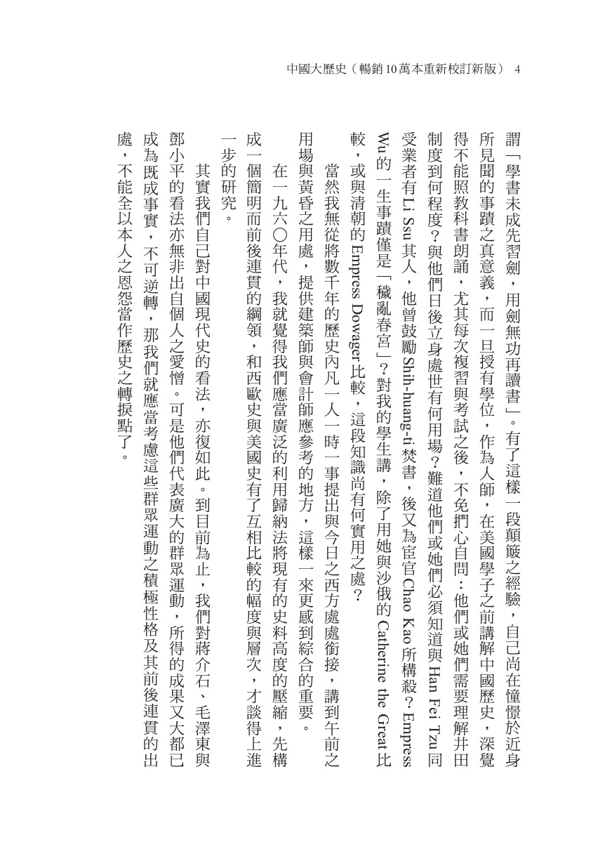 大部原因出自命運之安排。我年輕時在國軍服務十年,解甲退伍之後,負笈於海外,可謂「學書未成先習劍,用劍無功再讀書」。有了這樣一段顛簸之經驗,自己尚在憧憬於近身所見聞的事蹟之真意義,而一旦授有學位,作為人師,在美國學子之前講解中國歷史,深覺得不能照教科書朗誦,尤其每次複習與考試之後,不免捫心自問:他們或她們需要理解井田制度到何程度?與他們日後立身處世有何用場?難道他們或她們必須知道與Han Fei Tzu同受業者有Li Ssu其人,他曾鼓勵Shih-huang-ti焚書,後又為宦官Chao Kao所構殺?Empress Wu的一生事蹟僅是「穢亂春宮」?對我的學生講,除了用她與沙俄的Catherine the Great比較,或與清朝的Empress Dowager比較,這段知識尚有何實用之處?