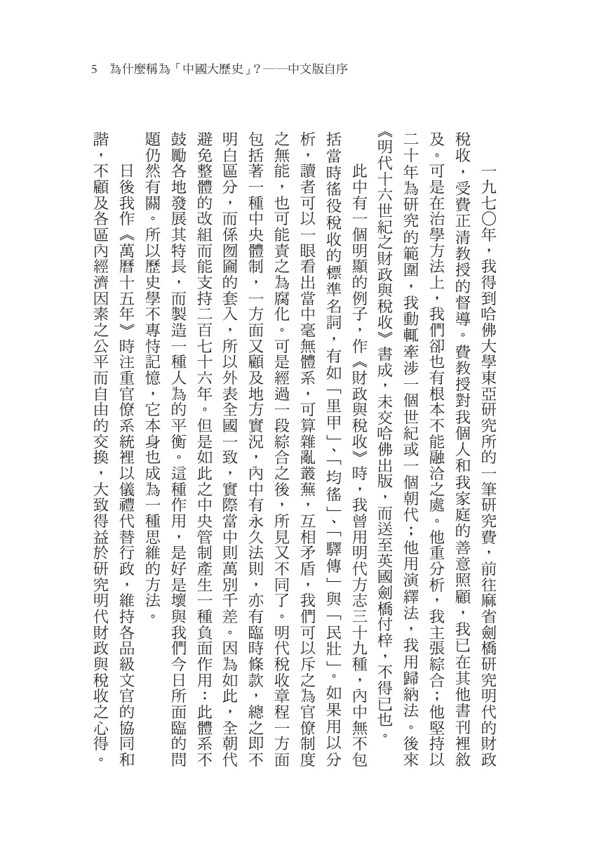一九七○年,我得到哈佛大學東亞研究所的一筆研究費,前往麻省劍橋研究明代的財政稅收,受費正清教授的督導。費教授對我個人和我家庭的善意照顧,我已在其他書刊裡敘及。可是在治學方法上,我們卻也有根本不能融洽之處。他重分析,我主張綜合;他堅持以二十年為研究的範圍,我動輒牽涉一個世紀或一個朝代;他用演繹法,我用歸納法。後來《明代十六世紀之財政與稅收》書成,未交哈佛出版,而送至英國劍橋付梓,不得已也。