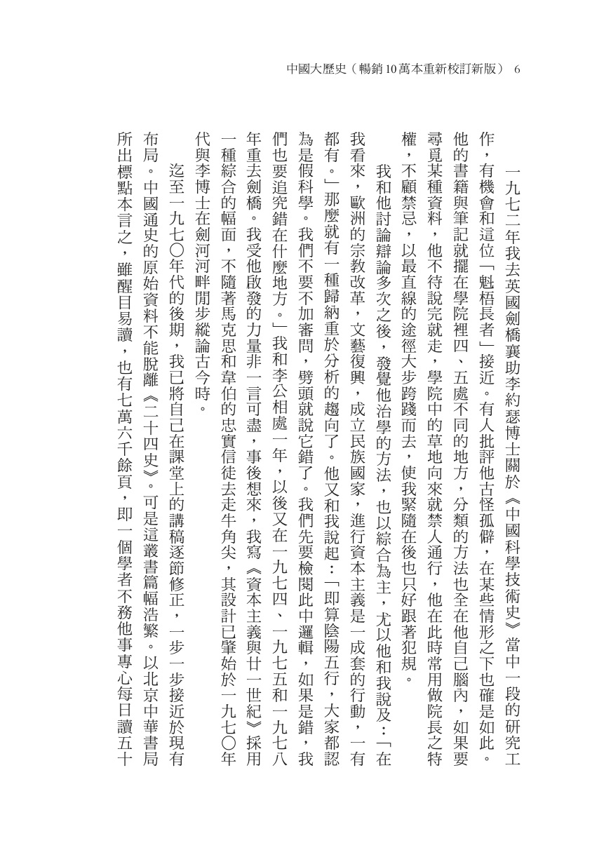 迄至一九七○年代的後期,我已將自己在課堂上的講稿逐節修正,一步一步接近於現有布局。中國通史的原始資料不能脫離《二十四史》。可是這叢書篇幅浩繁。以北京中華書局所出標點本言之,雖醒目易讀,也有七萬六千餘頁,即一個學者不務他事專心每日讀五十頁,也要四、五年,並且當中很多天文地理孝子節婦的記錄與今人甚少關係。《資治通鑑》也用《二十四史》作藍本,只是將分列在本紀、列傳、志各處的節目再加以不見於上篇幅之資料剪裁連綴成書,其弊也仍是過於支持傳統社會的價值。《資治通鑑》英譯為Comprehensive Mirror for Aid In Government,再直譯回來即是:「用以資助於行政的一面完全的鏡子」,這當然不放棄傳統道德的立場,而司馬光本人就捲入了王安石改革中的漩渦,他的觀念免不了一個歷史「應當如是」演進的偏見,而不及於我們亟欲知道「何以如是」展開的因果關係。