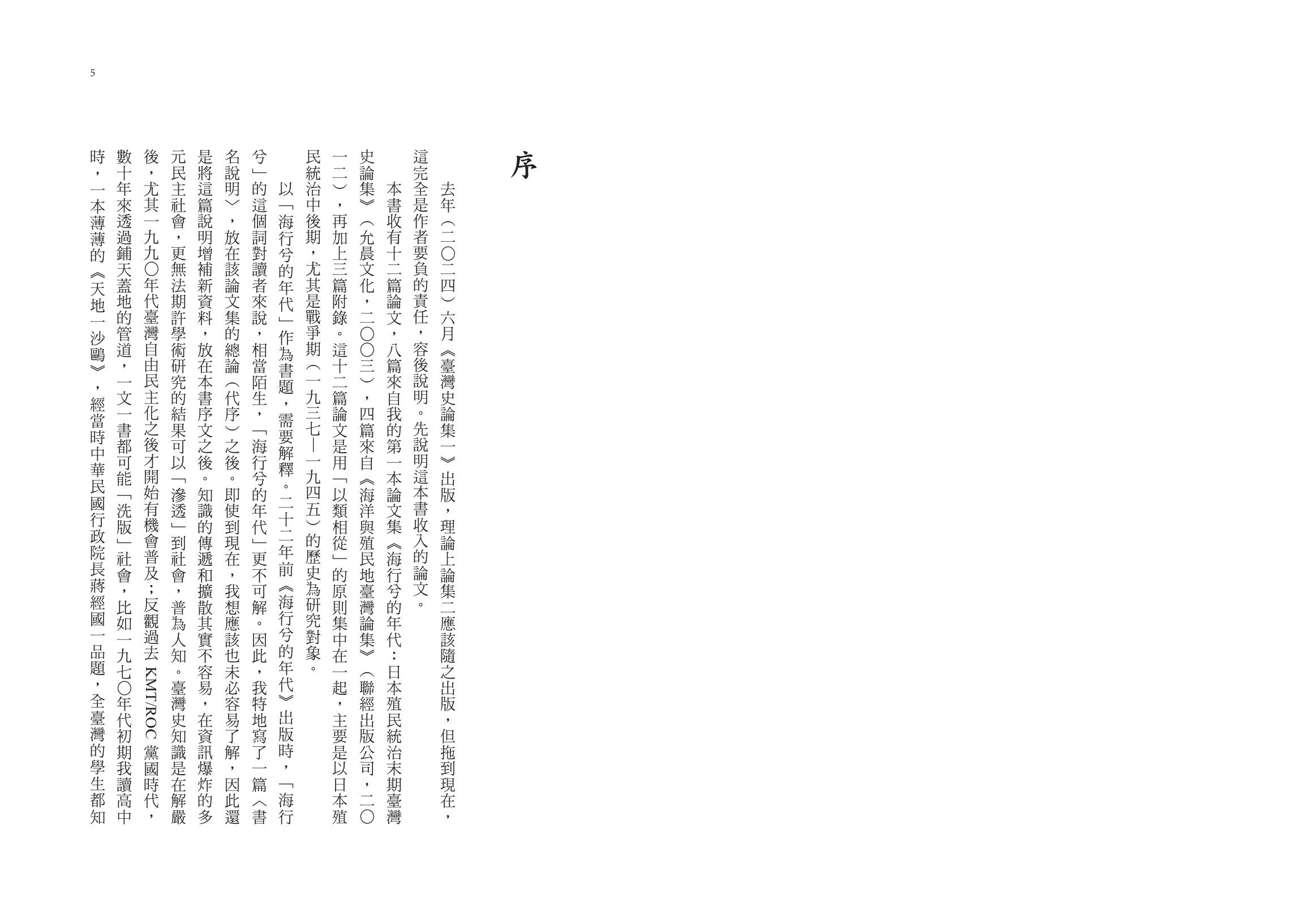 以「海行兮的年代」作為書題,需要解釋。二十二年前《海行兮的年代》出版時,「海行兮」的這個詞對讀者來說,相當陌生,「海行兮的年代」更不可解。因此,我特地寫了一篇〈書名說明〉,放在該論文集的總論(代序)之後。即使到現在,我想應該也未必容易了解,因此還是將這篇說明增補新資料,放在本書序文之後。知識的傳遞和擴散其實不容易,在資訊爆炸的多元民主社會,更無法期許學術研究的結果可以「滲透」到社會,普為人知。臺灣史知識是在解嚴後,尤其一九九○年代臺灣自由民主化之後才開始有機會普及;反觀過去 KMT/ROC 黨國時代,數十年來透過鋪天蓋地的管道,一文一書都可能「洗版」社會,比如一九七○年代初期我讀高中時,一本薄薄的《天地一沙鷗》,經當時中華民國行政院長蔣經國一品題,全臺灣的學生都知道,都要誦讀、學習,也是當時不知道有多少學生寫過的「命題作文」。這二、三十年來,在黨國約半世紀打造出來的自我繁殖的頑強生態中,如何在那非常有限的黨外運動奮鬥爭取到的小小空間,普及臺灣歷史的自我認知,一直是臺灣史研究者巨大的挑戰。