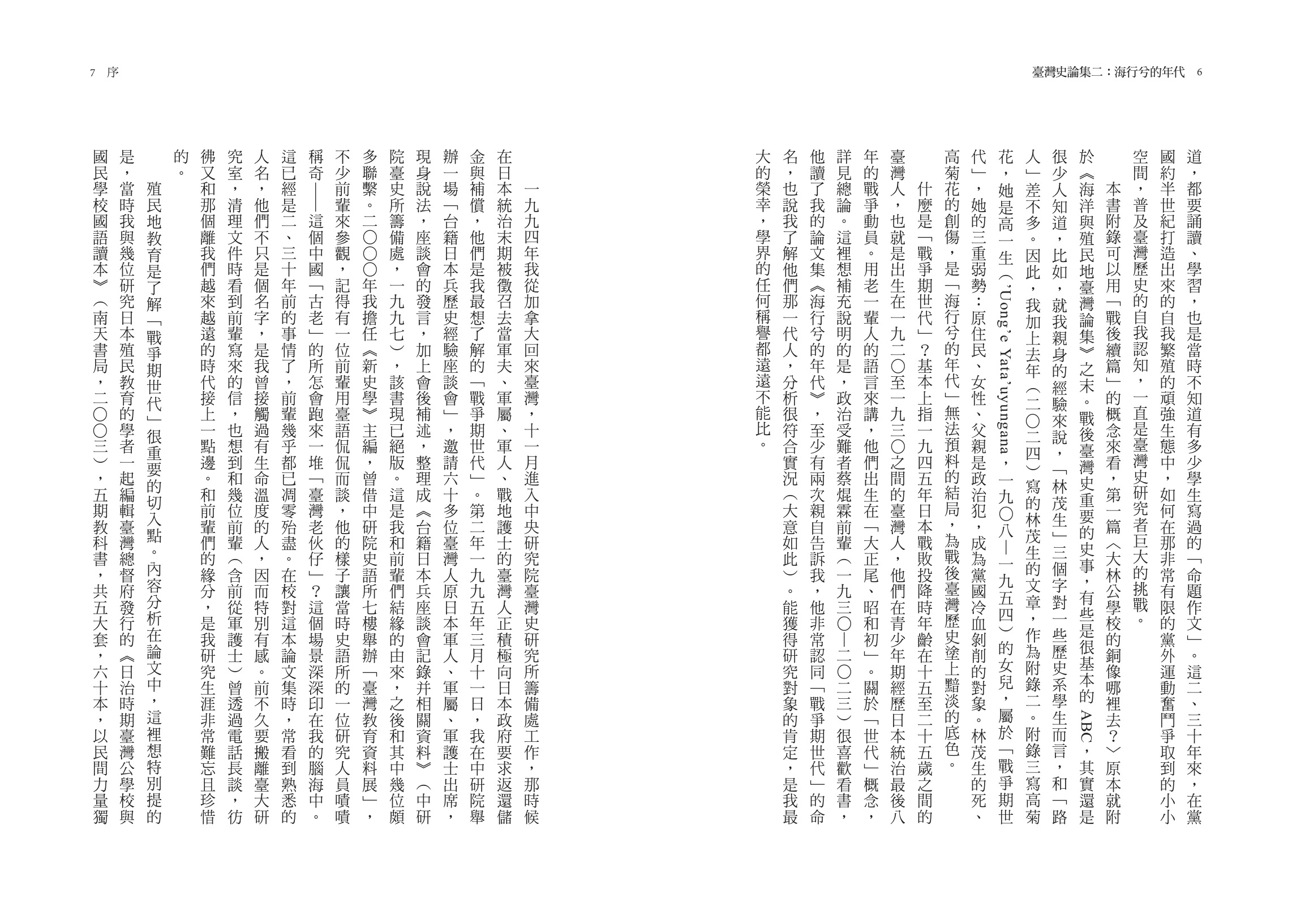 一九九四年我從加拿大回來臺灣,十一月進入中央研究院臺灣史研究所籌備處工作,那時候在日本統治末期被徵召去當軍夫、軍屬、軍人、戰地護士的臺灣人正積極向日本政府要求返還儲金與補償,他們是我最想了解的「戰爭期世代」。第二年一九九五年三月十一日,我在中研院舉辦一場「台籍日本兵歷史經驗座談會」,邀請六十多位臺灣人原日本軍人、軍屬、軍護士出席,現身說法,座談會的發言,加上會後補述,整理成《台籍日本兵座談會記錄并相關資料》(中研院臺史所籌備處,一九九七),該書現已絕版。這是我和前輩們結緣的由來,之後和其中幾位頗多聯繫。二○○○年我擔任《新史學》主編,曾借中研院史語所七樓舉辦「臺灣教育資料展」,不少前輩來參觀,記得有一位前輩用臺語侃侃而談,他的樣子讓當時史語所的一位研究人員嘖嘖稱奇—這個中國「古老」的所怎會跑來一堆「臺灣老伙仔」?這個場景深深印在我的腦海中。這已經是二、三十年前的事情了,前輩幾乎都已凋零殆盡。在校對這本論文集時,常看到熟悉的人名,他們不只是個名字,是我曾接觸過有生命溫度的人,因而特別有感。前不久要搬離臺大研究室,清理文件時看到前輩寫來的信,也想到和幾位前輩(含前從軍護士)曾透過電話長談,彷彿又和那個離我們越來越遠的時代接上一點邊。和前輩們的緣分,是我研究生涯非常難忘且珍惜的。