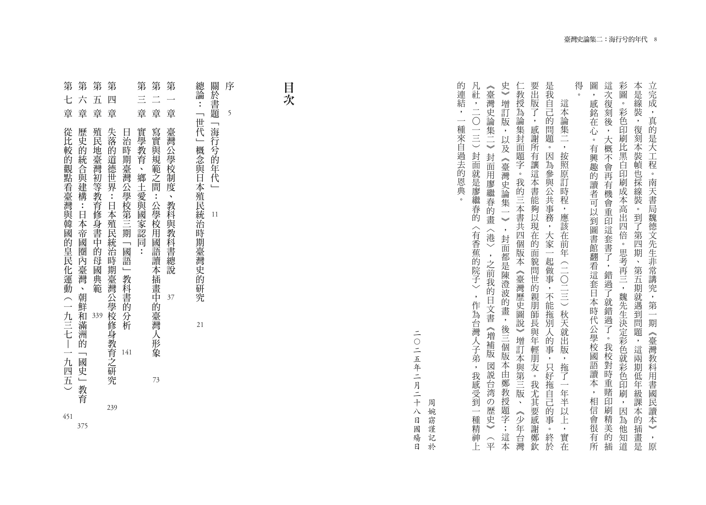 這本論集二,按照原訂時程,應該在前年(二○二三)秋天就出版,拖了一年半以上,實在是我自己的問題。因為參與公共事務,大家一起做事,不能拖別人的事,只好拖自己的事。終於要出版了,感謝所有讓這本書能夠以現在的面貌問世的親朋師長與年輕朋友。我尤其要感謝鄭欽仁教授為論集封面題字。我的三本書共四個版本《臺灣歷史圖說》增訂本與第三版、《少年台灣史》增訂版,以及《臺灣史論集一》,封面都是陳澄波的畫,後三個版本由鄭教授題字;這本《臺灣史論集二》封面用廖繼春的畫〈港〉,之前我的日文書《増補版 図説台湾の歴史》(平凡社,二○一三)封面就是廖繼春的〈有香蕉的院子〉,作為台灣人子弟,我感受到一種精神上的連結,一種來自過去的恩典。