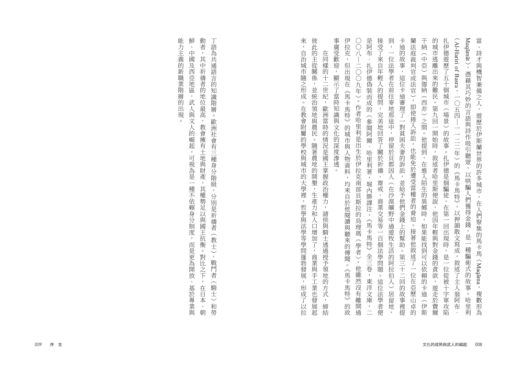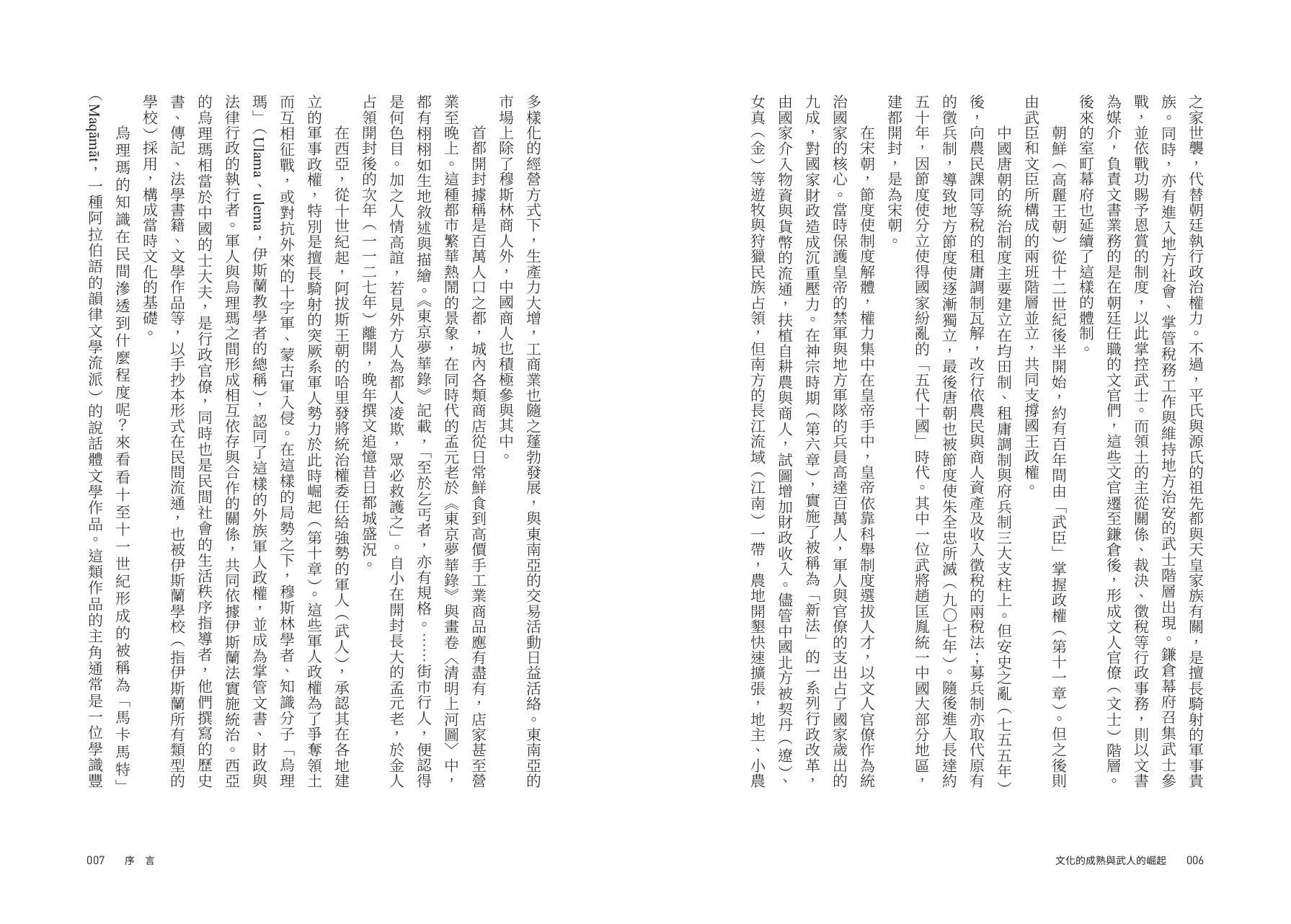 在西亞,從十世紀起,阿拔斯王朝的哈里發將統治權委任給強勢的軍人(武人),承認其在各地建立的軍事政權,特別是擅長騎射的突厥系軍人勢力於此時崛起(第十章)。這些軍人政權為了爭奪領土而互相征戰,或對抗外來的十字軍、蒙古軍入侵。在這樣的局勢之下,穆斯林學者、知識分子「烏理瑪」(Ulama、ulema,伊斯蘭教學者的總稱),認同了這樣的外族軍人政權,並成為掌管文書、財政與法律行政的執行者。軍人與烏理瑪之間形成相互依存與合作的關係,共同依據伊斯蘭法實施統治。西亞的烏理瑪相當於中國的士大夫,是行政官僚,同時也是民間社會的生活秩序指導者,他們撰寫的歷史書、傳記、法學書籍、文學作品等,以手抄本形式在民間流通,也被伊斯蘭學校(指伊斯蘭所有類型的學校)採用,構成當時文化的基礎。