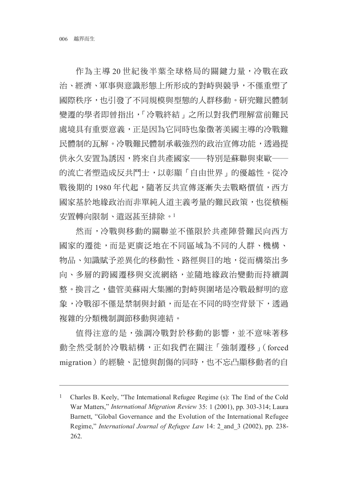 然而,冷戰與移動的關聯並不僅限於共產陣營難民向西方國家的遷徙,而是更廣泛地在不同區域為不同的人群、機構、物品、知識賦予差異化的移動性、路徑與目的地,從而構築出多向、多層的跨國遷移與交流網絡,並隨地緣政治變動而持續調整。換言之,儘管美蘇兩大集團的對峙與圍堵是冷戰最鮮明的意象,冷戰卻不僅是禁制與封鎖,而是在不同的時空背景下,透過複雜的分類機制調節移動與連結。