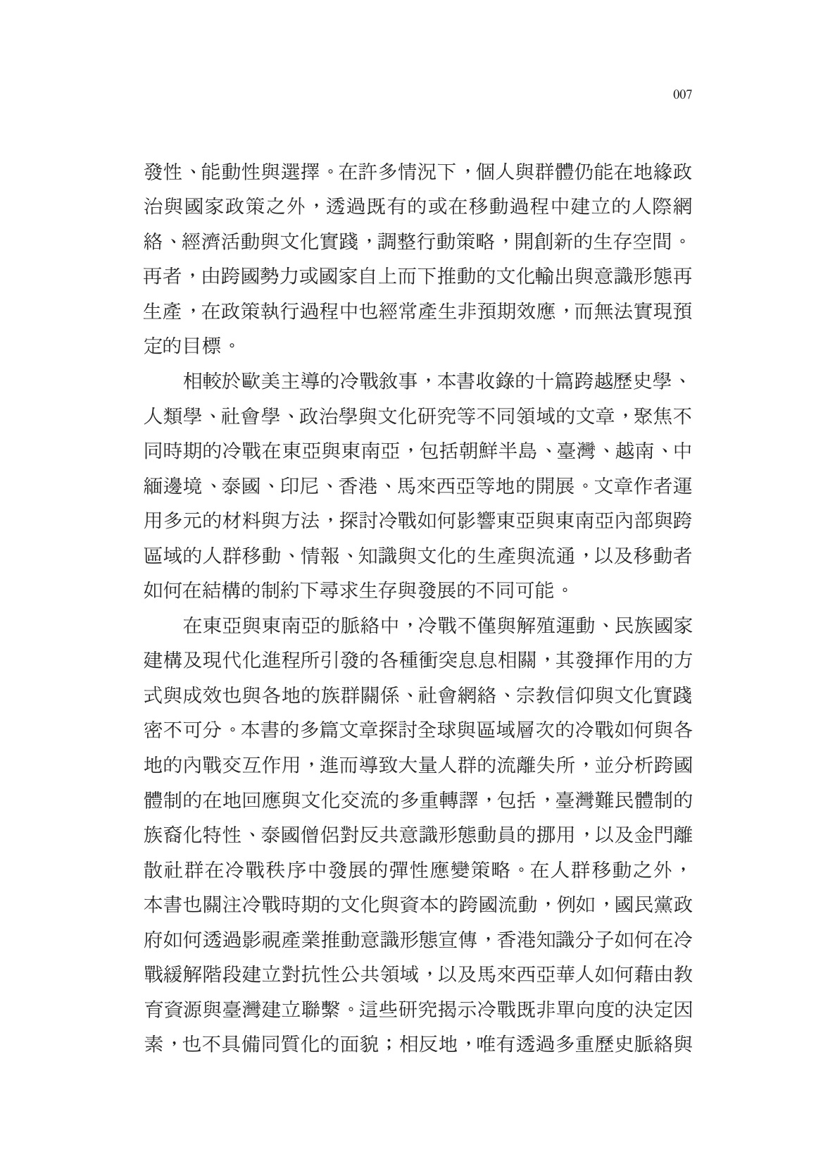 在東亞與東南亞的脈絡中,冷戰不僅與解殖運動、民族國家建構及現代化進程所引發的各種衝突息息相關,其發揮作用的方式與成效也與各地的族群關係、社會網絡、宗教信仰與文化實踐密不可分。本書的多篇文章探討全球與區域層次的冷戰如何與各地的內戰交互作用,進而導致大量人群的流離失所,並分析跨國體制的在地回應與文化交流的多重轉譯,包括,臺灣難民體制的族裔化特性、泰國僧侶對反共意識形態動員的挪用,以及金門離散社群在冷戰秩序中發展的彈性應變策略。在人群移動之外,本書也關注冷戰時期的文化與資本的跨國流動,例如,國民黨政府如何透過影視產業推動意識形態宣傳,香港知識分子如何在冷戰緩解階段建立對抗性公共領域,以及馬來西亞華人如何藉由教育資源與臺灣建立聯繫。這些研究揭示冷戰既非單向度的決定因素,也不具備同質化的面貌;相反地,唯有透過多重歷史脈絡與地域視角,才能不以偏概全地理解冷戰的具體作用。