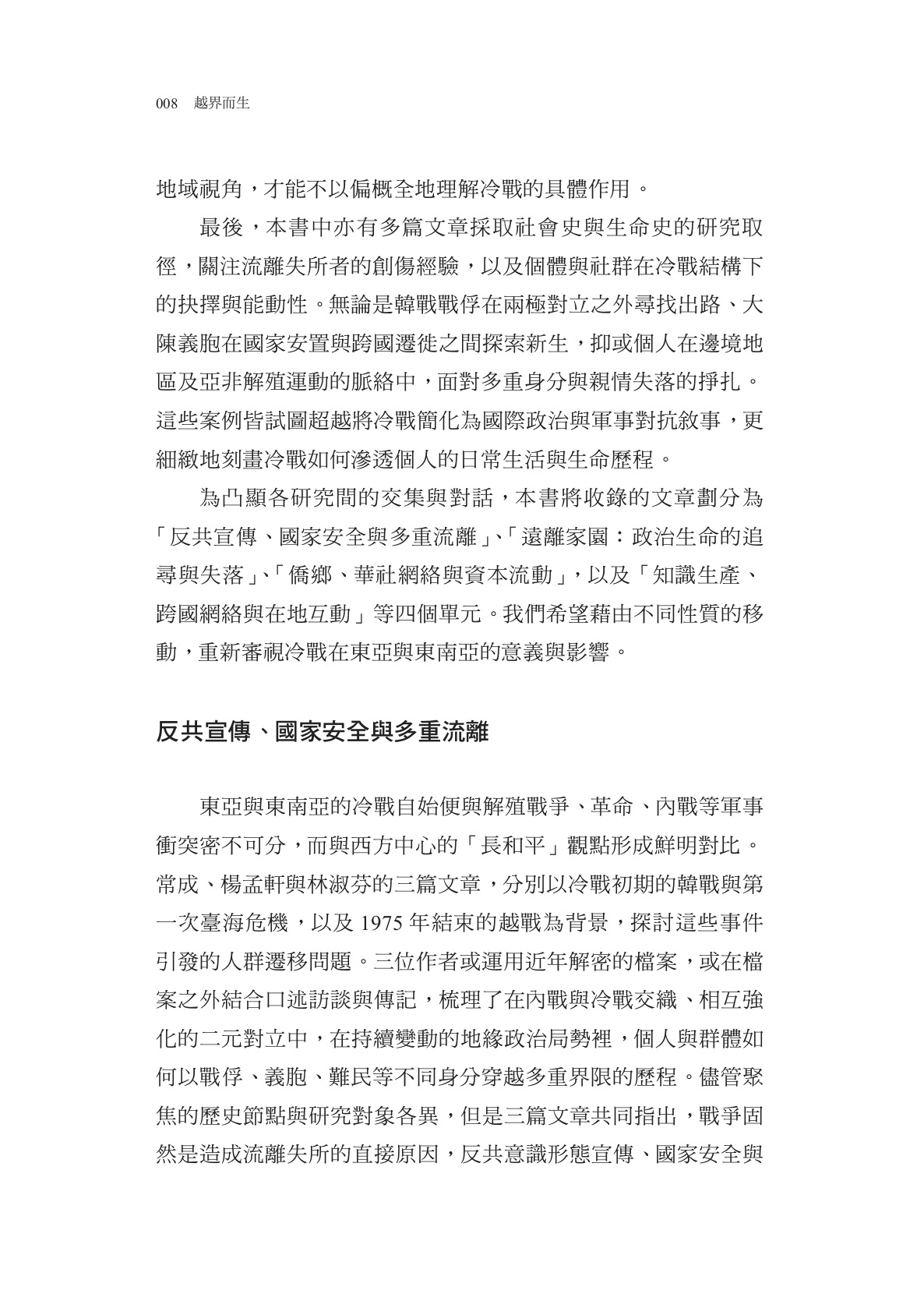 為凸顯各研究間的交集與對話,本書將收錄的文章劃分為「反共宣傳、國家安全與多重流離」、「遠離家園:政治生命的追尋與失落」、「僑鄉、華社網絡與資本流動」,以及「知識生產、跨國網絡與在地互動」等四個單元。我們希望藉由不同性質的移動,重新審視冷戰在東亞與東南亞的意義與影響。