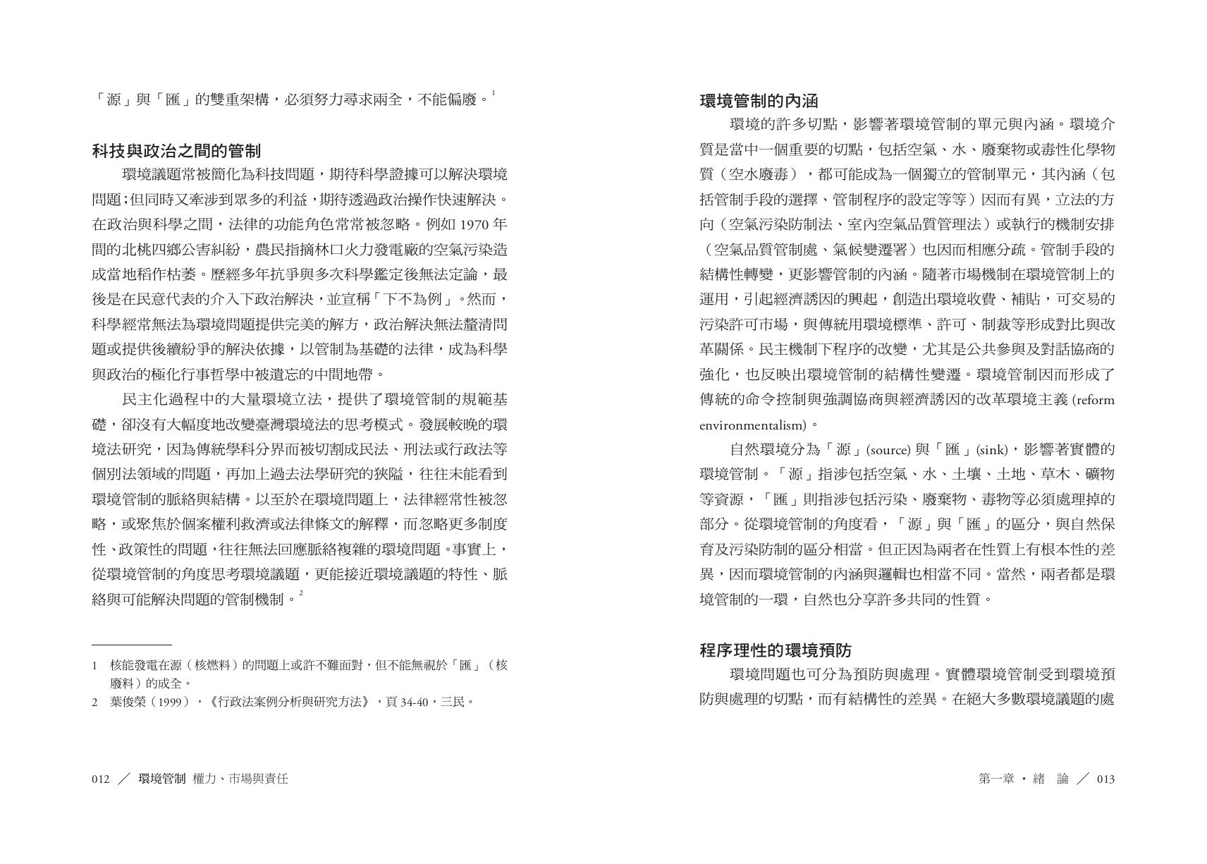這樣一個豐富的脈絡發展,在臺灣的發展歷程上,也是如質如實地反覆呈現。在環境法的學習上不斷論辯,除了以法律為基礎思考環保外,更必須在制度、人心、科技與市場面向上反覆辯證,最終孕育出從管制看待環境的環境法,而這也是本書的精神韻味所在。
