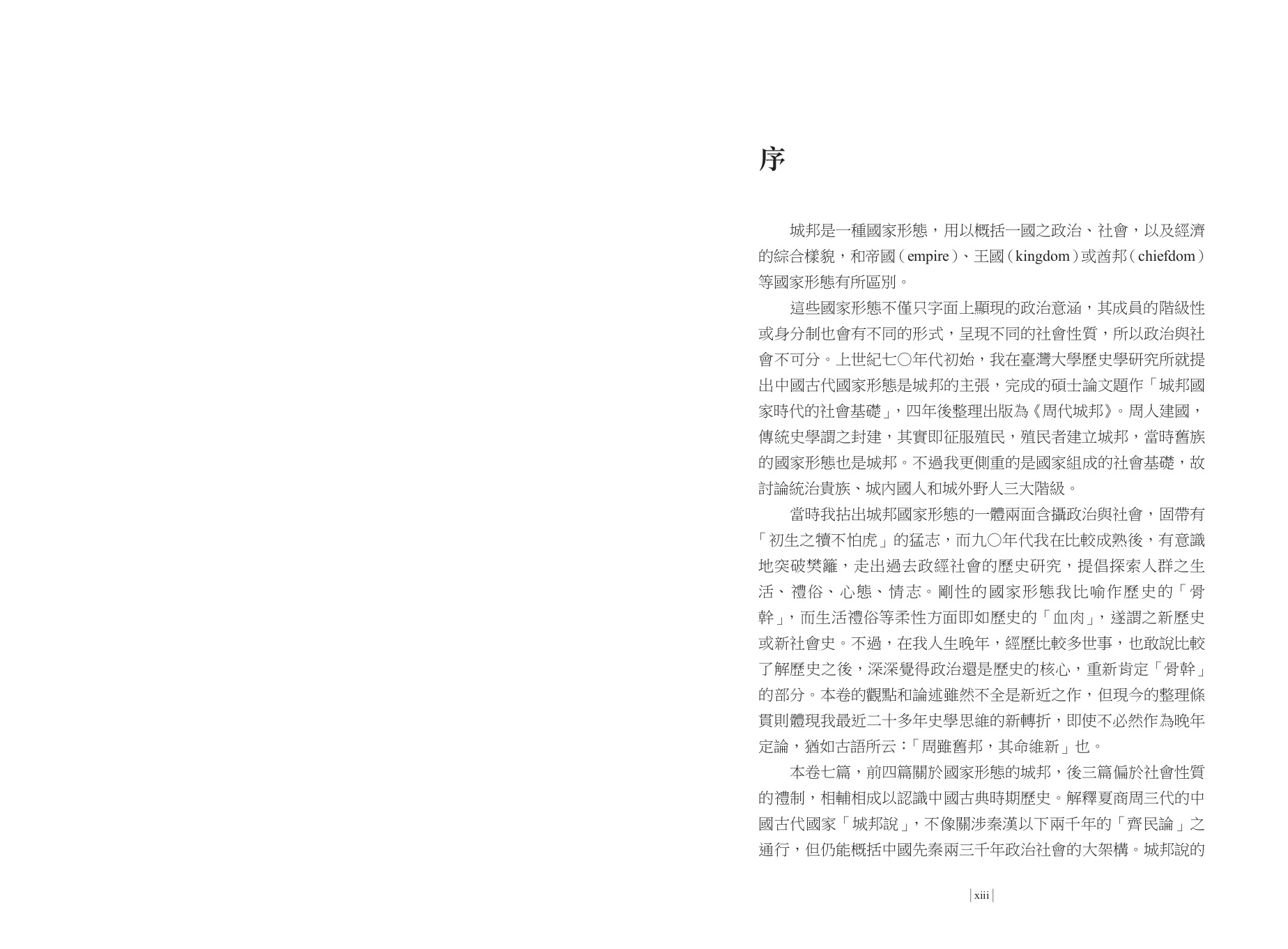 大抵而言,九○年以前我的古史著作屬於「初訪」,包括《周代城邦》、《編戶齊民》和《古代社會與國家》,以後是「再訪」,本系列所收五卷文字即是。這只是概略的畫分,九○以後另有已刊書和未刊文都沒有收入;而本系列所收者也含有九○以前之作,因為我的中國古史研究一些基本核心觀念仍然持續著,不至於矛盾或感覺突兀。