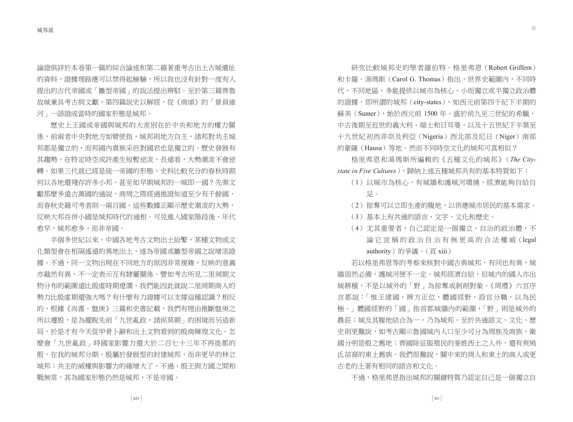 不過,格里弗恩指出城邦的關鍵特質乃認定自己是一個獨立自治的政治體,(頁 xiv)倒是正確的。以中國古代城邦來說,即使有更高的共主,即《史記.五帝本紀》的五帝及夏商周三代的國君,也無礙於它們內政的獨立自主。至於他說城邦公民擁有實質的能力以獨立地治理他們自己,不同歷史文化條件的城邦恐怕存在著不同程度的差異,本卷的〈城邦說〉和〈城與城邦〉二文都指出中國城邦自由民(國人)預政的限度。
