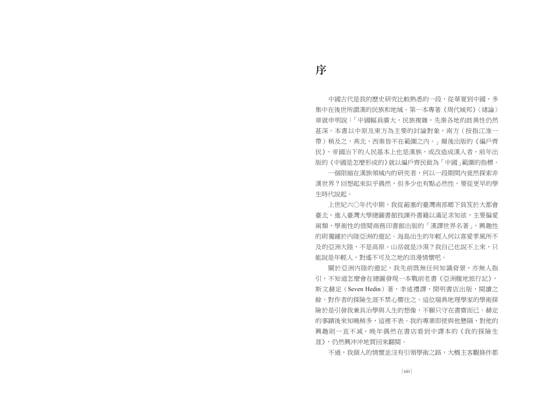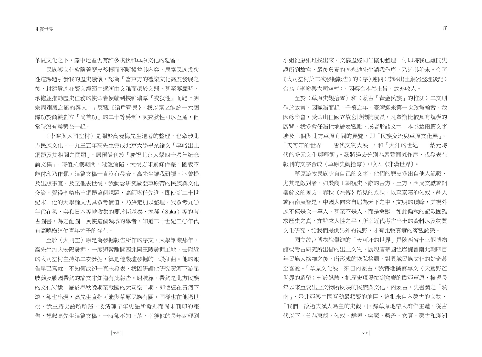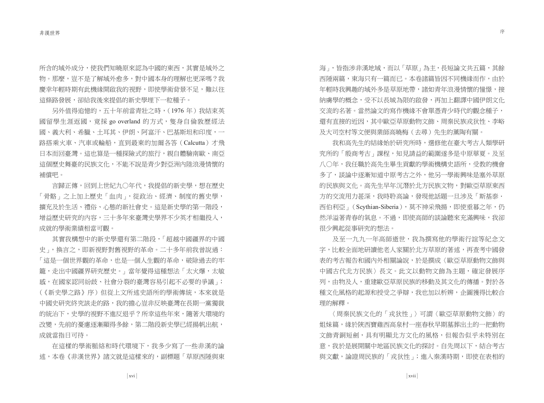 在這樣的學術脈絡和時代環境下,我多少寫了一些非漢的論述,本卷《非漢世界》諸文就是這樣來的,副標題「草原西陲與東海」,皆指涉非漢地域,而以「草原」為主,長短論文共五篇,其餘西陲兩篇,東海只有一篇而已。本卷諸篇皆因不同機緣而作,由於年輕時我興趣的域外多是草原地帶,諸如青年浪漫情懷的憧憬,接納虜學的概念,受不以長城為限的啟發,再加上翻譯中國伊朗文化交流的名著。當然論文的寫作機緣不會單憑青少時代的觀念種子,還有直接的近因,其中歐亞草原動物文飾、周秦民族戎狄性、李峪及大司空村等文便與業師高曉梅(去尋)先生的薰陶有關。