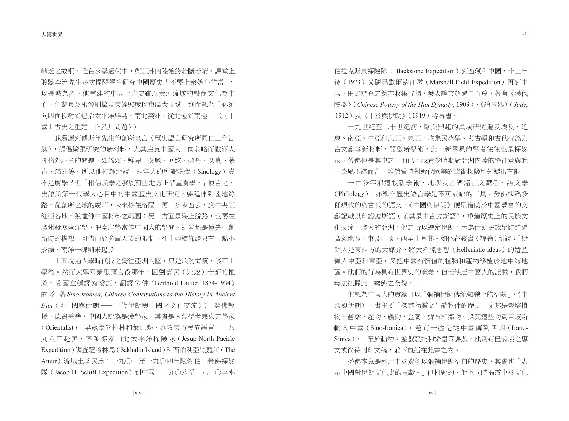 勞佛本意是利用中國資料以彌補伊朗空白的歷史,其實也「表示中國對伊朗文化史的貢獻。」但相對的,他也同時揭露中國文化所含的域外成分,使我們知曉原來認為中國的東西,其實是域外之物。那麼,豈不是了解域外愈多,對中國本身的理解也更深嗎?我慶幸年輕時期有此機緣開啟我的視野,即使學術背景不足,難以往這條路發展,卻給我後來提倡的新史學埋下一粒種子。