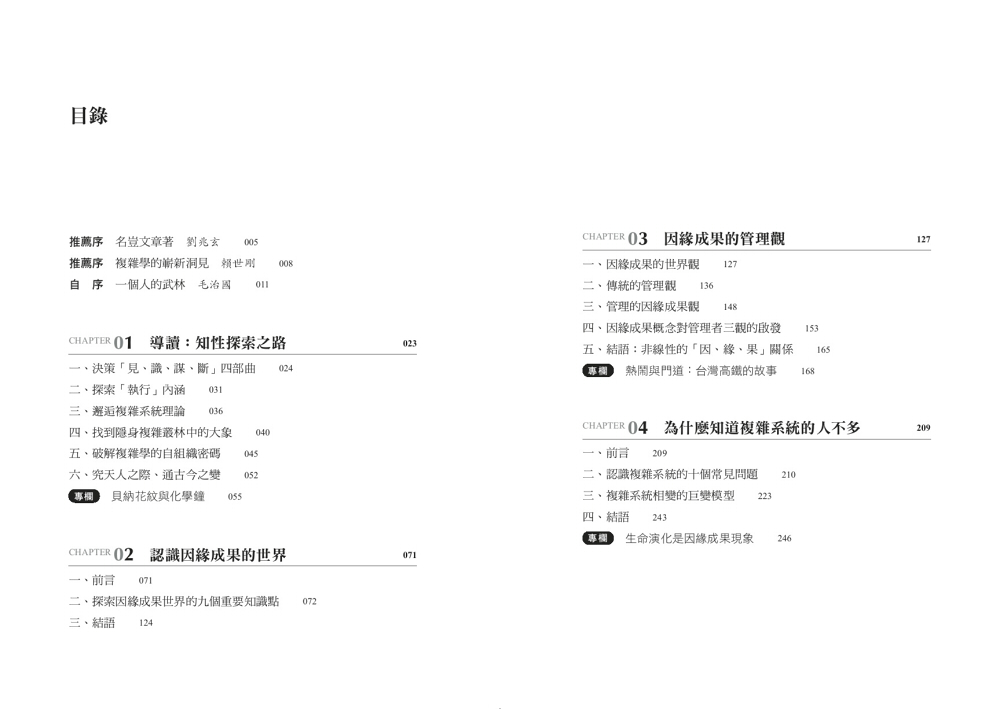 毛治國教授的書不僅告訴我們組織系統是如何運作的,更重要的是它同時指引我們應該如何在複雜的自組織及他組織環境中自處。相信這本書不僅能在管理學中提出新的見解,同時對複雜學的發展也具有顯著的貢獻,甚至可進而促成複雜學成為21世紀以華人為主的科學。