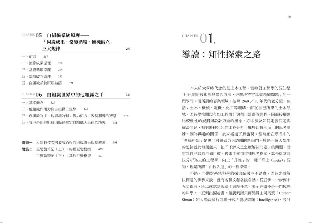 就在這個當頭,不期而遇以美國聖塔菲研究所(Santa Fe Institute)為搖籃,於1980 年代開始發展,透過一般人很陌生的「自組織(self-organization)」現象,作為共同探討焦點的一籃子複雜系統理論(complex system theories)。我直覺認知到這些理論似乎都以「摸象」的方式,分別提供著可用來建構出一頭完整「大象」的素材,而這頭「大象」就是我所要追尋,可用來化解當前系統理論典範危機的新系統論。於是一個長達30餘年,利用公餘之暇,去尋找隱身在複雜學叢林中「大象」的工作,就此展開。這方面的雛形成果,我已在2018年出版的《管理》一書中呈現;而本書則是相關的成果,經過再接再厲的錘鍊後的完整版。