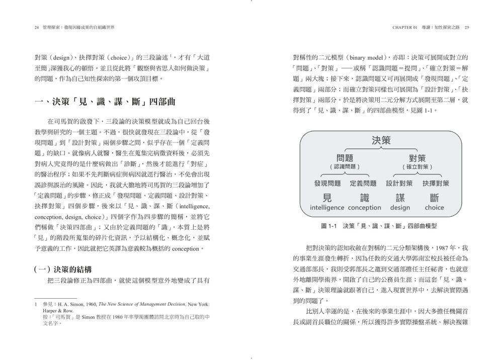 在司馬賀的啟發下,三段論的決策模型就成為自己回台後教學與研究的一個主題。不過,很快就發現在三段論中,從「發現問題」到「設計對策」兩個步驟之間,似乎存在一個「定義問題」的缺口。就像病人就醫,醫生在蒐集完病徵資料後,必須先對病人究竟得的是什麼病做出「診斷」,然後才能進行「對症」的醫治程序;如果不先判斷病症與病因就逕行醫治,不免會出現誤診與誤治的風險。因此,我就大膽地將司馬賀的三段論增加了「定義問題」的步驟,修正成「發現問題、定義問題、設計對策、抉擇對策」四個步驟,後來以「見、識、謀、斷(intelligence,conception, design, choice)」四個字作為四步驟的簡稱,並將它們稱做「決策四部曲」;又由於定義問題的「識」,本質上是將「見」的階段所蒐集的碎片化資訊,予以結構化、概念化,並賦予意義的工作,因此就把它英譯為意義較為概括的 conception。