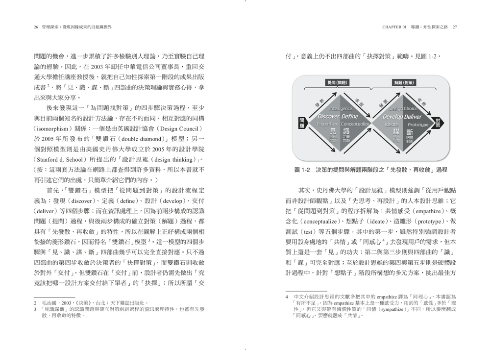 將探討人類抽象決策過程的「見、識、謀、斷」四部曲,與著眼於硬體設計的「雙鑽石」和「設計思維」模型,拿來相互對照與比較,主要是用說明在探索「為問題找對策」這一議題時,不同領域的研究者似乎都不約而同地得到了:只要用上四個步驟,就可充分涵蓋整個過程的結論(這一殊途同歸的事實,等同是一種另類的相互認證)。而對我在「一人武林」中所修鍊出來的「見、識、謀、斷」決策模型,竟然與其他兩個「武林門派」所提出的成果,出現了「英雄所見略同(great minds thinkalike)」的高度一致性,讓我不禁為自己感到高興。