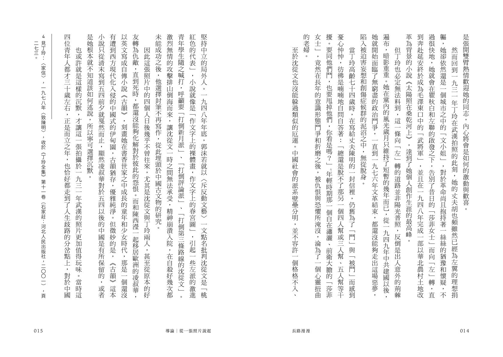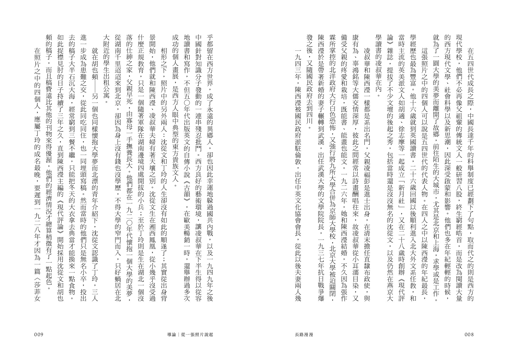 在這張照片之中的四個人,從左到右分別是:陳西瀅(一八九六—一九七〇)、凌叔華(一九〇〇—一九九〇)、丁玲(一九〇四—一九八六)以及沈從文(一九〇二—一九八八),按照學者史華慈(Benjamin I. Schwartz)的定義,他們四人都是出生在清末一八九五年到一九〇五年之間的五四世代中的「學生一代」。