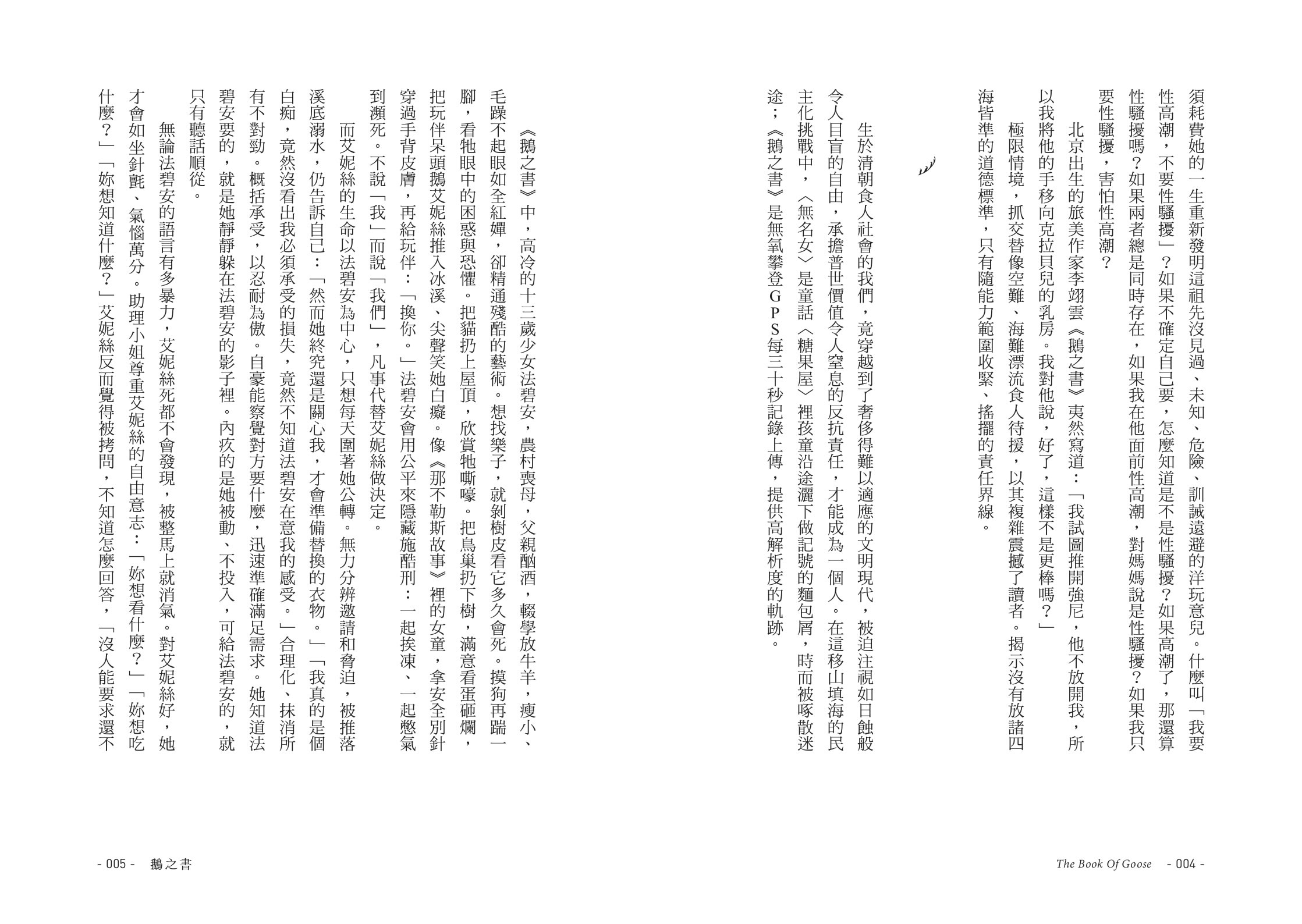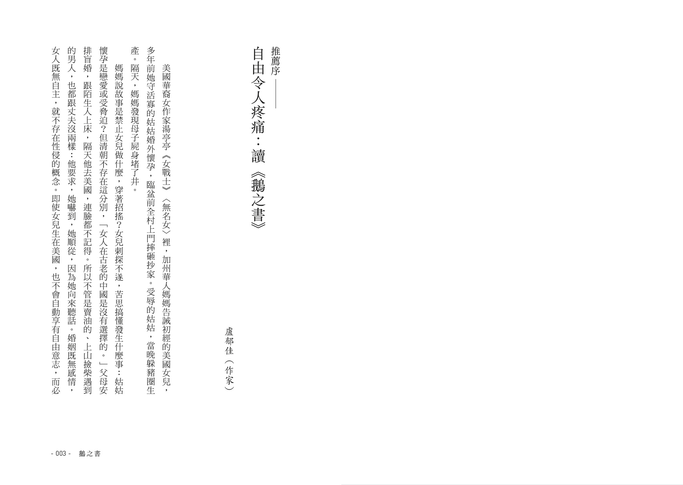 生於清朝食人社會的我們,竟穿越到了奢侈得難以適應的文明現代,被迫注視如日蝕般令人目盲的自由,承擔普世價值令人窒息的反抗責任,才能成為一個人。在這移山填海的民主化挑戰中,〈無名女〉是童話〈糖果屋〉裡孩童沿途灑下做記號的麵包屑,時而被啄散迷途;《鵝之書》是無氧攀登GPS每30秒記錄上傳,提供高解析度的軌跡。