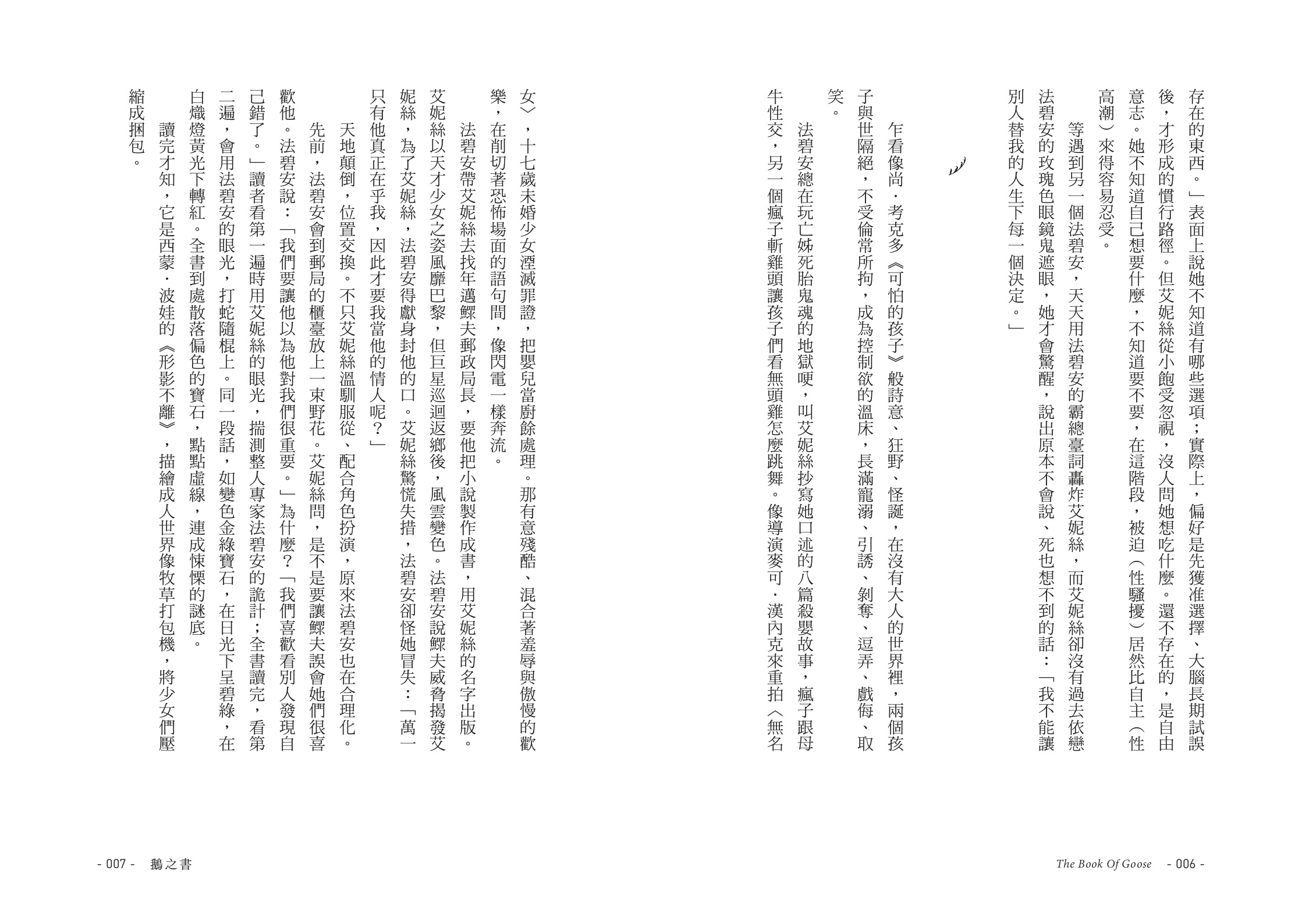 《鵝之書》中,高冷的十三歲少女法碧安,農村喪母,父親酗酒,輟學放牛羊,瘦小、毛躁不起眼如全紅嬋,卻精通殘酷的藝術。想找樂子,就剝樹皮看它多久會死。摸狗再踹一腳,看牠眼中的困惑與恐懼。把貓扔上屋頂,欣賞牠嘶嚎。把鳥巢扔下樹,滿意看蛋砸爛,把玩伴呆頭鵝艾妮絲推入冰溪、尖聲笑她白癡。像《那不勒斯故事》裡的女童,拿安全別針穿過手背皮膚,再給玩伴:「換你。」法碧安會用公平來隱藏施酷刑:一起挨凍、一起憋氣到瀕死。不說「我」而說「我們」,凡事代替艾妮絲做決定。