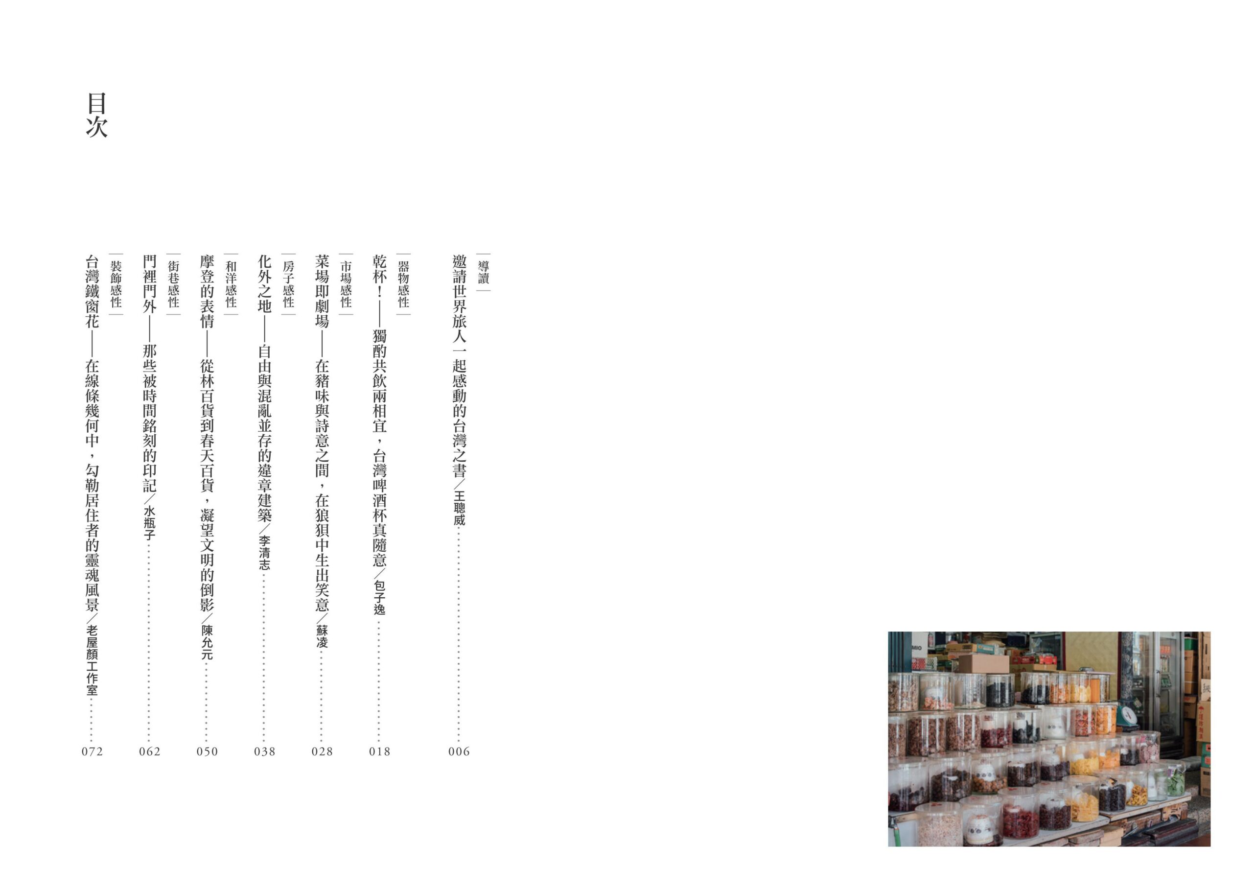 所有關於「台灣感性」的定義、詮譯、描述、關鍵詞,您都可以在網路上查到各種資料,我從這裡頭,依個人偏好抽出二十一個主題:器物、市場、房子、和洋、街巷、裝飾、符號、招牌、寺廟、手搖、小吃、手藝、顏色、氣味、聲音、節慶、常日、人情、民主、多元、助人。這不可能完全涵蓋「台灣感性」的範圍,但我想可以提供一個廣大的面貌,然後跟兩位編輯陳永芬、施彥如一起討論作家人選,我期待作家撰寫的不是對某個「主題」的泛論文章,而是從這主題裡,自由地找出一處細節,一個小物來撰文,亦如您所見,我們所邀請的並不限制於文學作家,而是對該主題極為熱愛,又投入極長時間關注的參與者。
