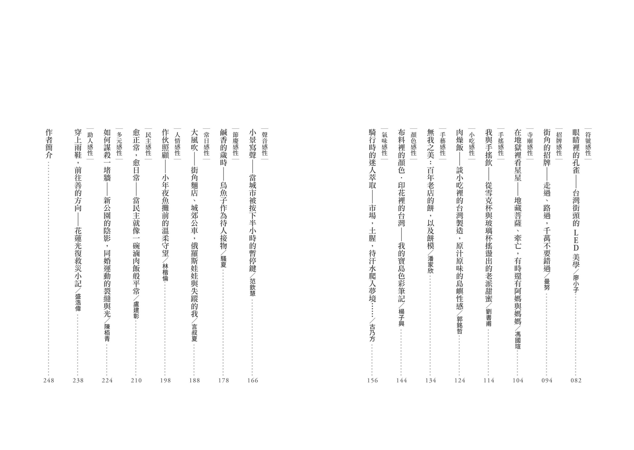 本書集合21位作家與創作者的全新書寫,從不同角度描繪「台灣感性」,以文字捕捉、重拾生活中那些我們早已習以為常,卻如此值得凝視的小事小物。
