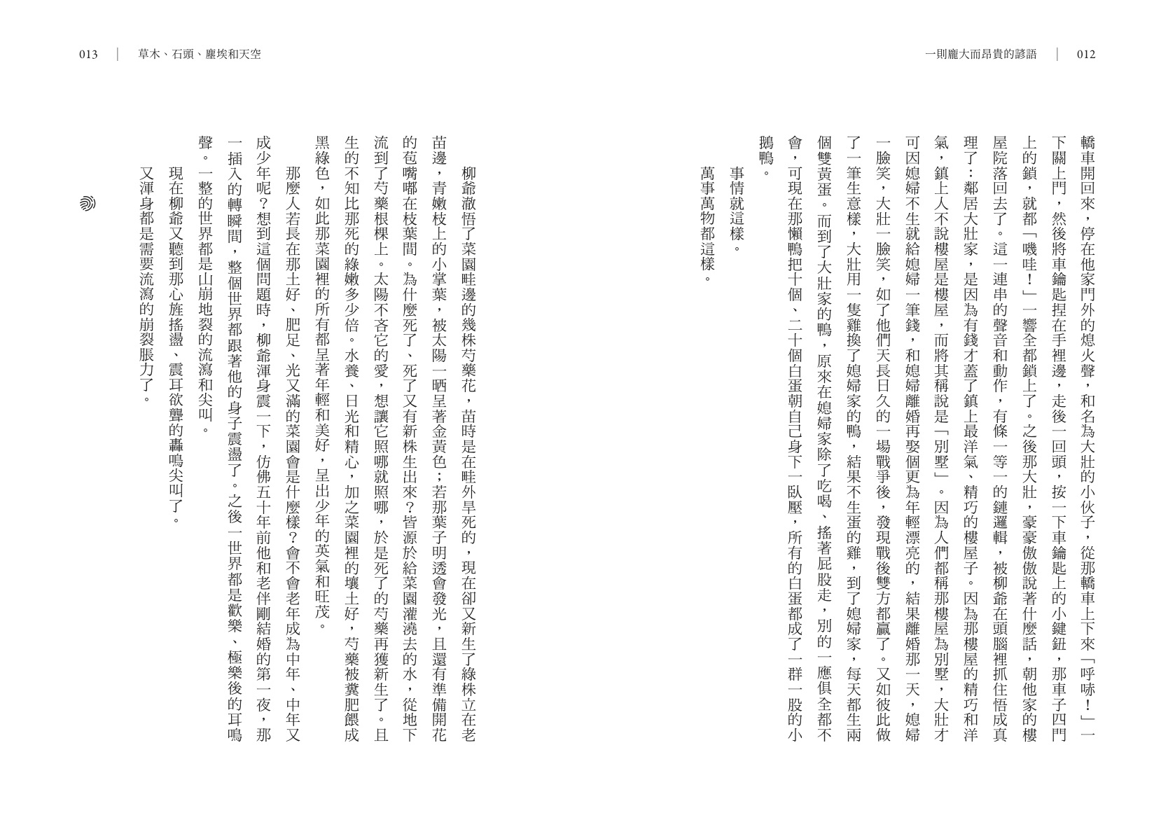 在年歲走枯、力不從心澈底到來前,我急趕急地用三、四年時間寫了一部完全不出版的書。初稿完成後,請了三幾嘴風如獄的摯親同仁去閱讀,繼而根據他們的直感反覆、反覆改。從三十五萬字,改至二十七、八萬,而又忽然發現愈改愈是不滿意,忽地人就崩潰了。覺得衰老至前了。為了使這部既不在大陸出版簡體版,也不在港臺出版繁體版,更不在世界上任何國家、任何語言、做任何翻譯的書稿能夠繼續改下去,我開始丟下那未了的長篇寫起短篇小說來。每寫一個短篇後,再回頭去拾起那部長篇改一稿。改了一稿後,再丟下去寫上一、二短篇作為調整、休息、補缺和續思。就這樣把那部長篇基本改定並交給兒子囑他永不出版將其作為家物私藏到他也終是年老時,再取出來交給他的兒女們。如此緣東得西的這部《一則龐大而昂貴的諺語》的短篇集,也就隨之成形、落稿為現在這個樣子了。