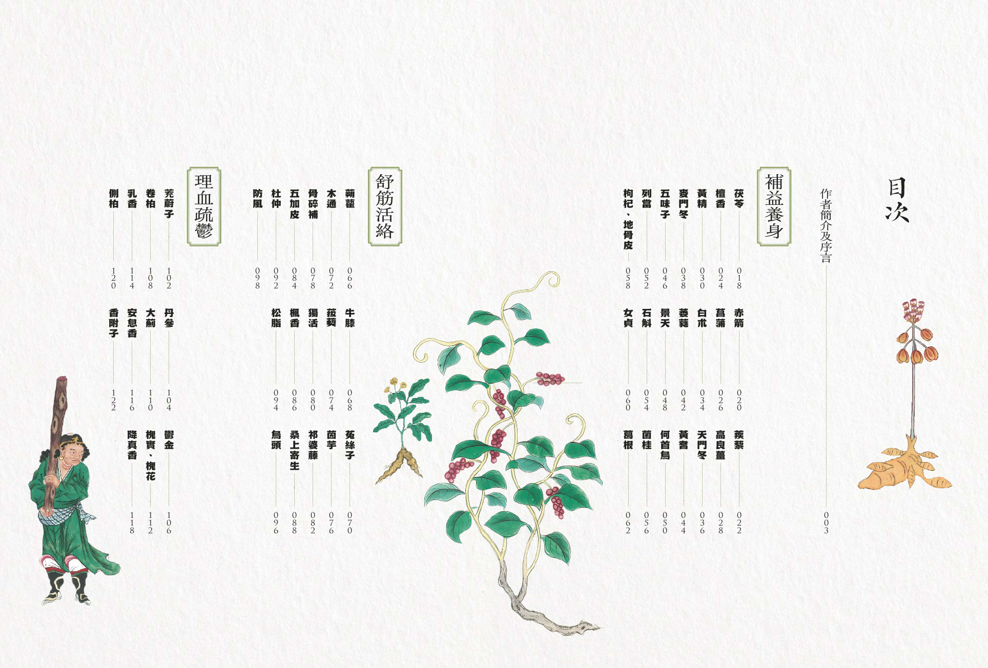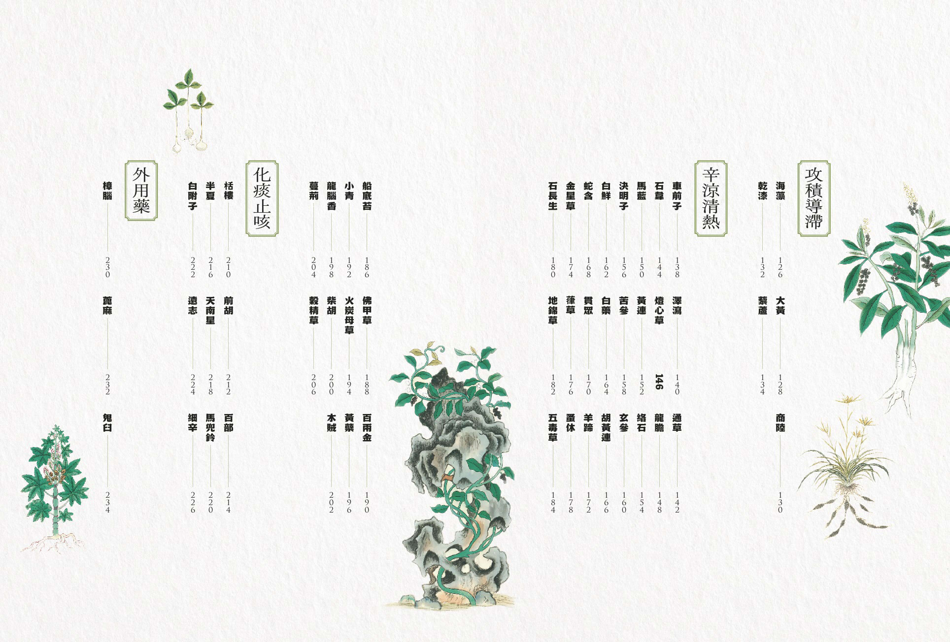 其中《藥草篇》精選百種療癒植物,依主要功效分為「補益養身」、「舒筋活絡」、「理血疏鬱」、「攻積導滯」、「辛涼清熱」、「化痰止咳」及「外用藥」七大類別,從古方智慧到植物科學,展開一場關於療癒、自然與身體感知的深度對話。