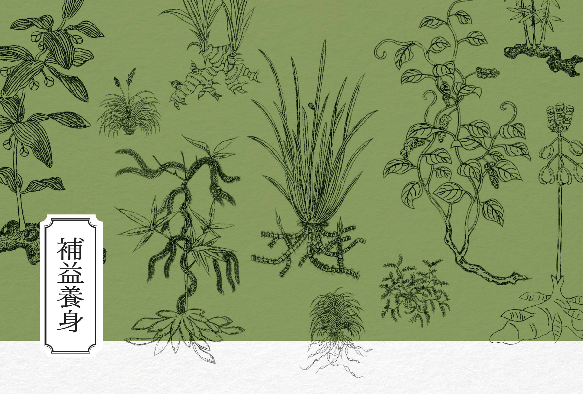 茯苓/赤箭/蒺藜/檀香/菖蒲/高良薑/黃精/白朮/天門冬/麥門冬/萎蕤/黃耆/五味子/景天/何首烏/列當/石斛/菌桂/枸杞、地骨皮/女貞/葛根