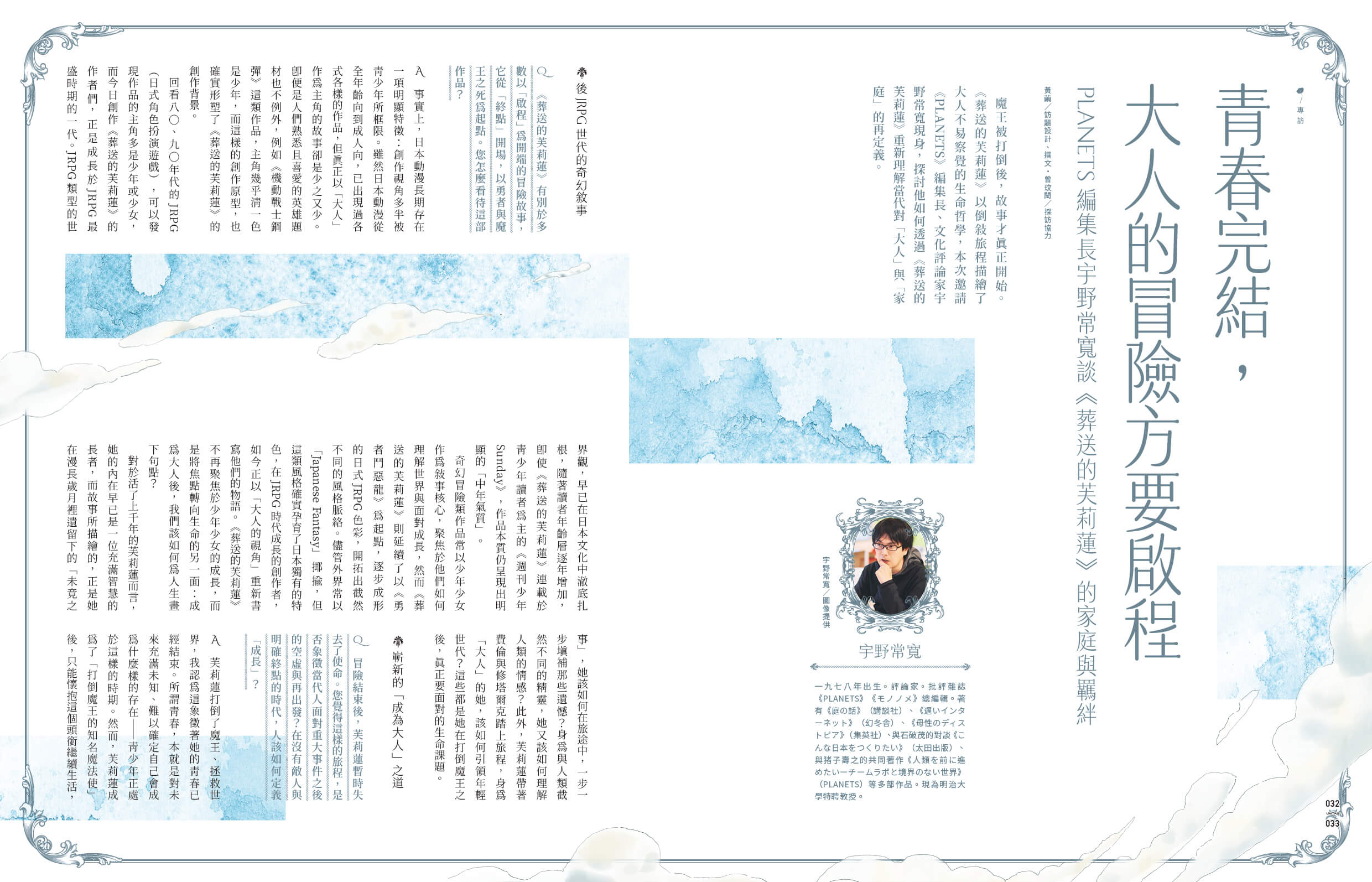 在那之後,勇者一行人被歌頌、記憶,復又被遺忘,芙莉蓮與人們相遇,又被時間強迫著學會離別——精靈,是否真能理解人類的「情感」?本期雜誌,我們邀請到《葬送的芙莉蓮》的漫畫責編小倉功雅受訪,談他如何參與並思考這部作品;並邀請日本評論家宇野常寬分享他如何看待奇幻敘事與真實世界的關聯;此外,也收錄作家沐羽與劉揚銘的專文,談角色們如何理解彼此、理解情感,並做出各種撼動人生走向的抉擇。