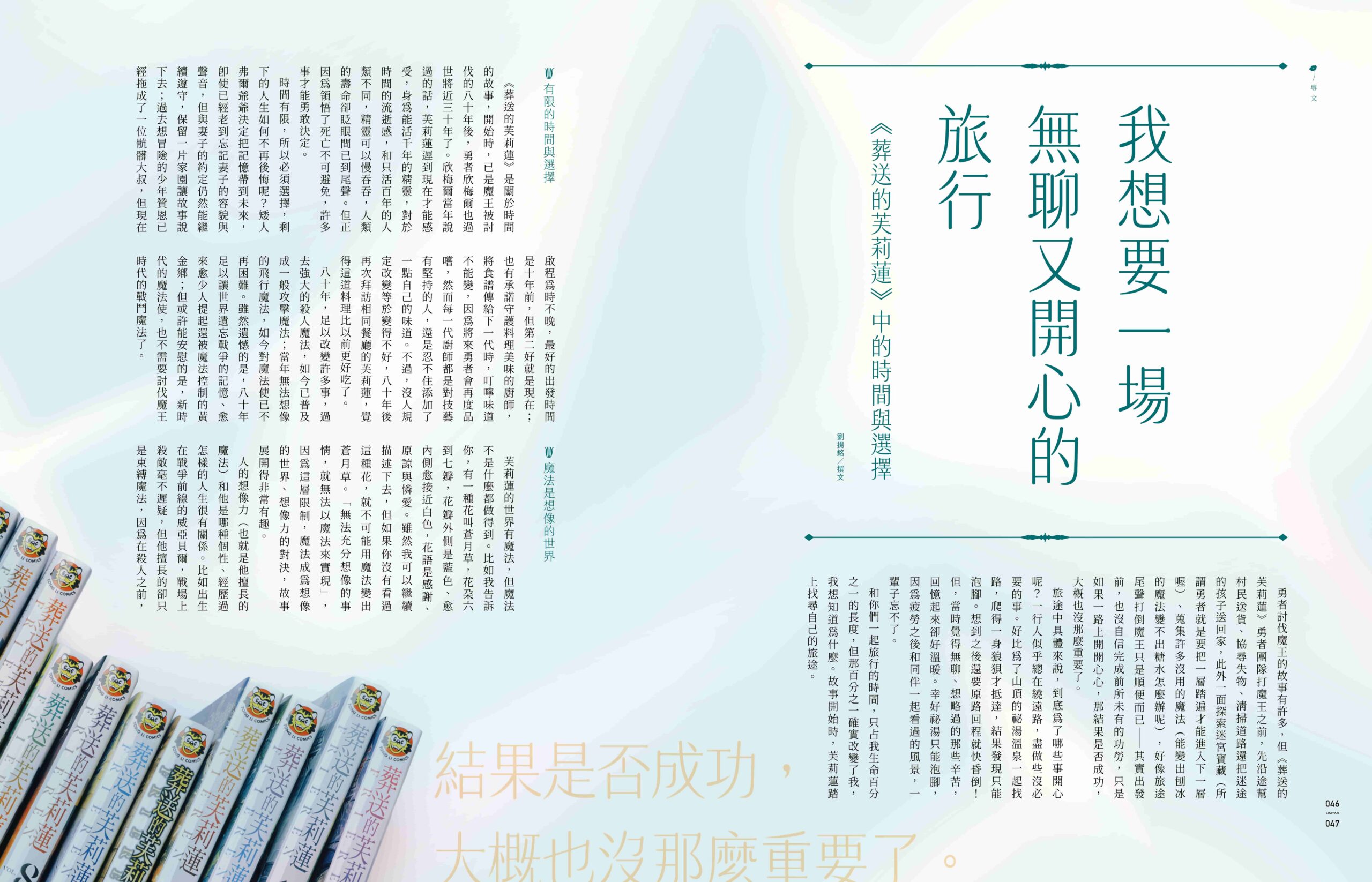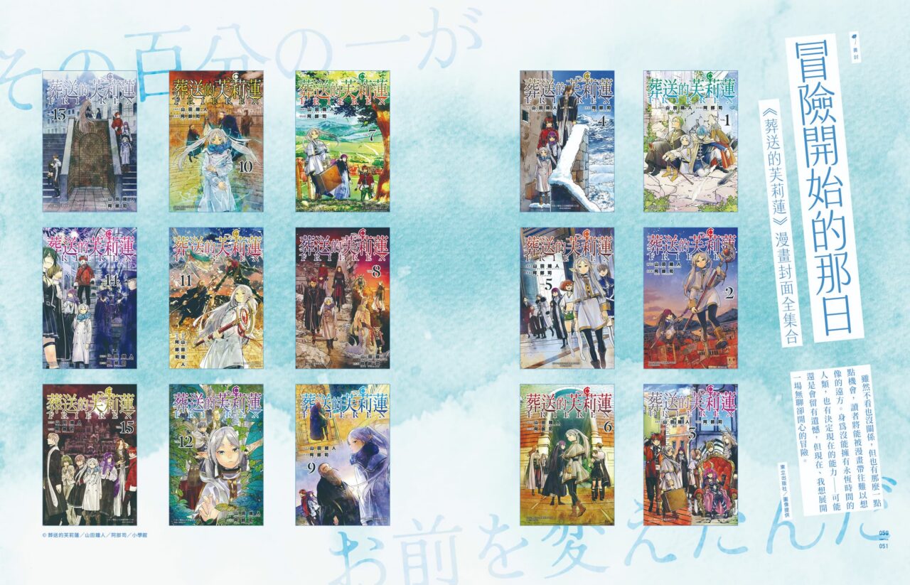 二〇二〇年,《葬送的芙莉蓮》漫畫開始連載。以「冒險結束」為名展開的第一話上,剛打倒了魔王的人類勇者欣梅爾正思考著未來的人生,一旁,精靈魔法使芙莉蓮正安靜地讀著書,「你接下來的人生,將會漫長到⋯⋯我們都無法想像呢。」芙莉蓮眼都沒抬,「或許是吧。」她回應,像是書以外的世界都與她無關。