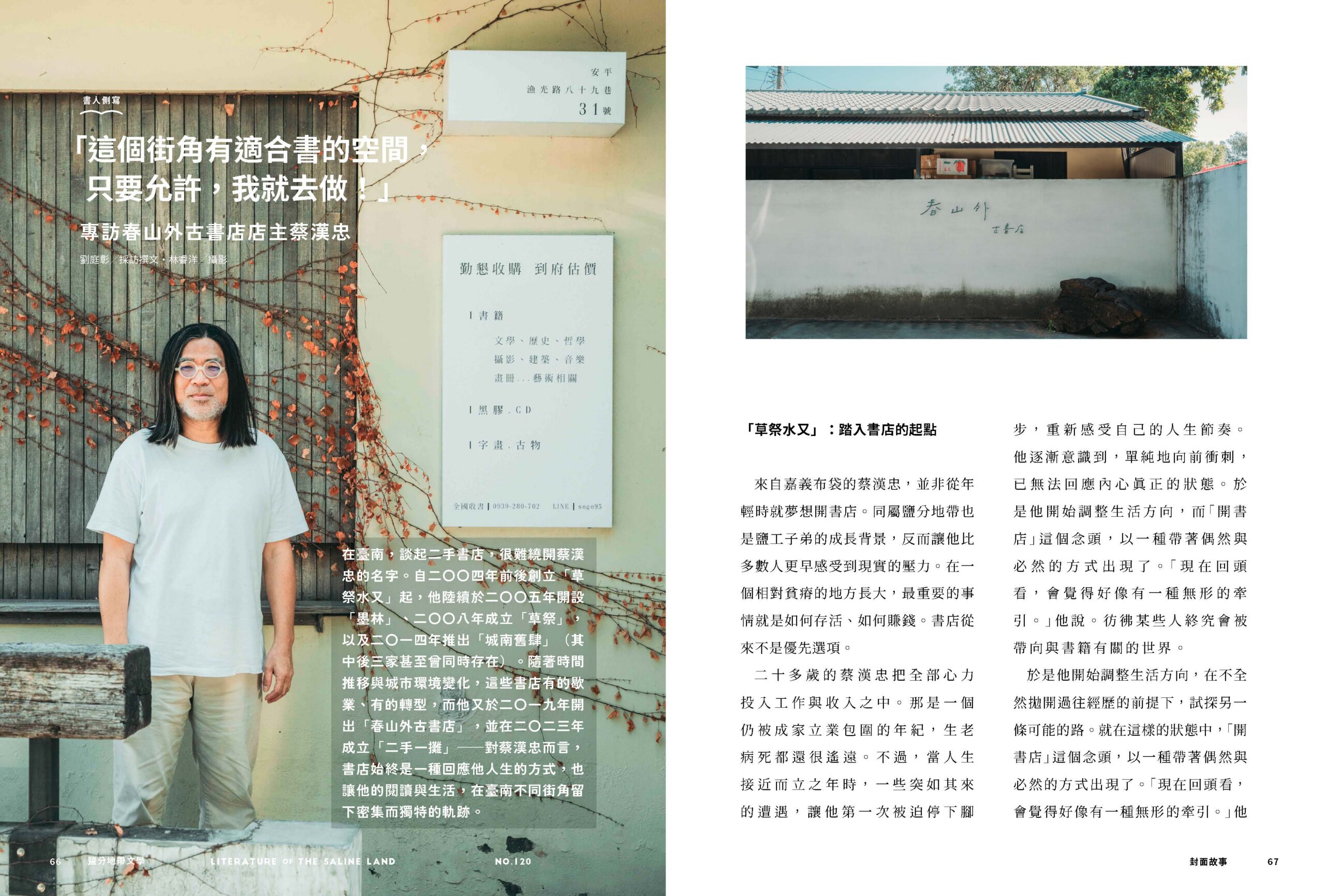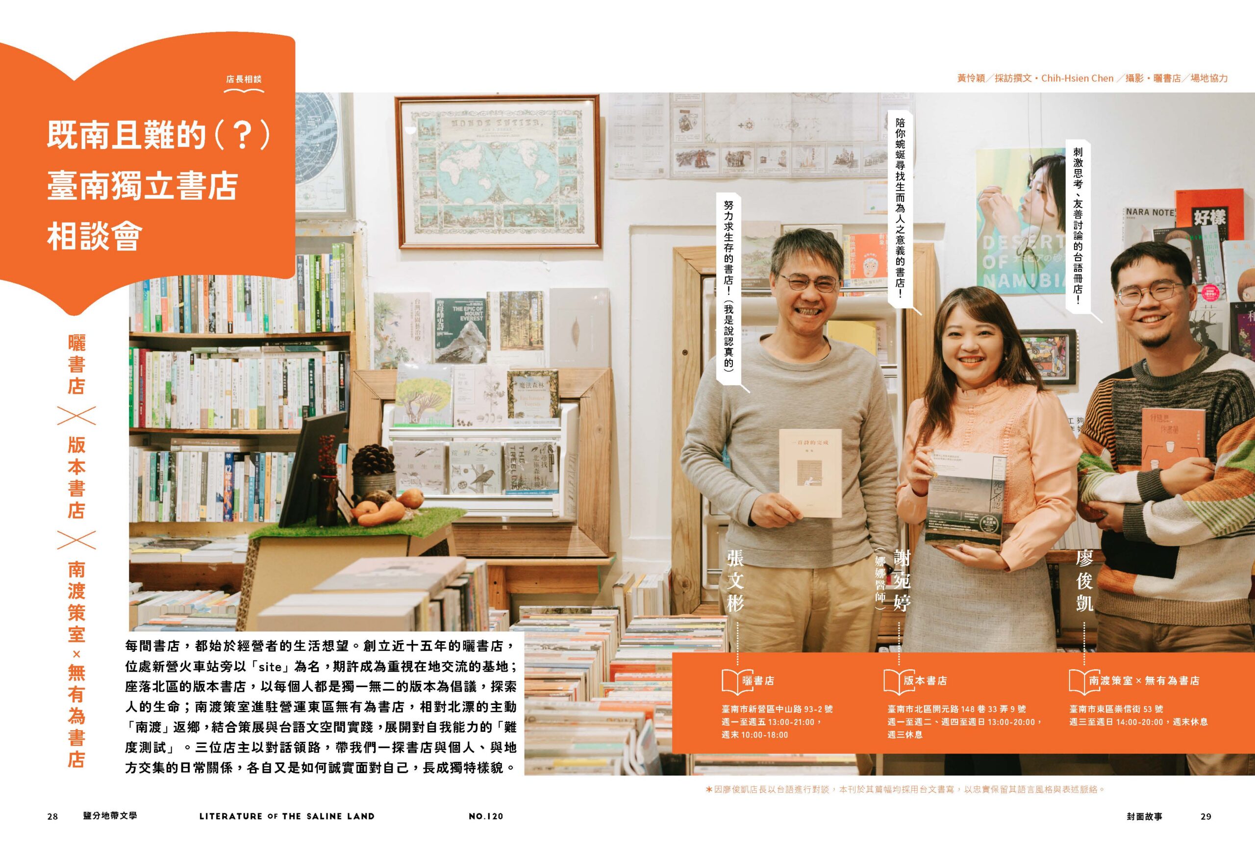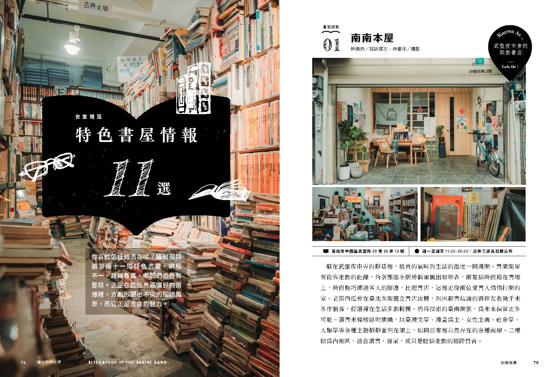 書店即生活,也是了解一個地方的重要方式!本期專輯聚焦臺南獨立書店與二手書店的日常風景。我們邀請曬書店、版本書店,以及南渡策室✕無有為書店的老闆們同桌相談,討論「既南且難」的現實與選擇;我們也來到攝影、漫畫與非典型書店現場,帶你認識新世代的書店面目;談起臺南書店,不能錯過重要書人蔡漢忠,編輯部亦登上漁光島拜訪,請益他的書業小史與生命軌跡。此外,專輯安排作家潘家欣獨門帶路她的書店心頭好,吳昭明淺談記憶裡的府城老書局印象。最後並有特派員走訪臺南各地,為你特選十一家風格書屋的最新情報。