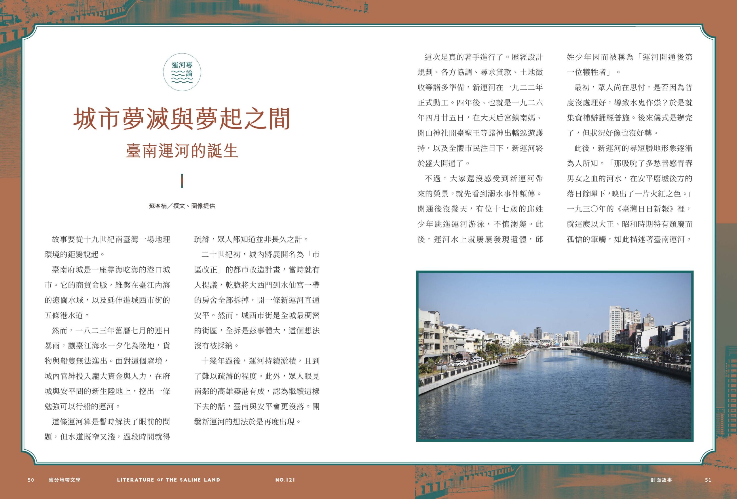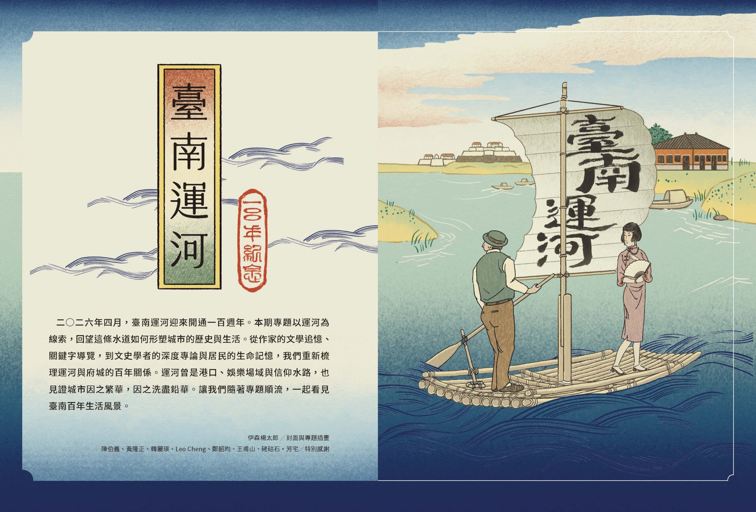 二○二六年四月,臺南運河迎來開通一百週年。本期專題以運河為線索,回望這條水道如何形塑城市的歷史與生活。從作家的文學追憶、關鍵字導覽,到文史學者的深度專論與居民的生命記憶,我們重新梳理運河與府城的百年關係。運河曾是港口、娛樂場域與信仰水路,也見證城市因之繁華,因之洗盡鉛華。讓我們隨著專題順流,一起看見臺南百年生活風景。