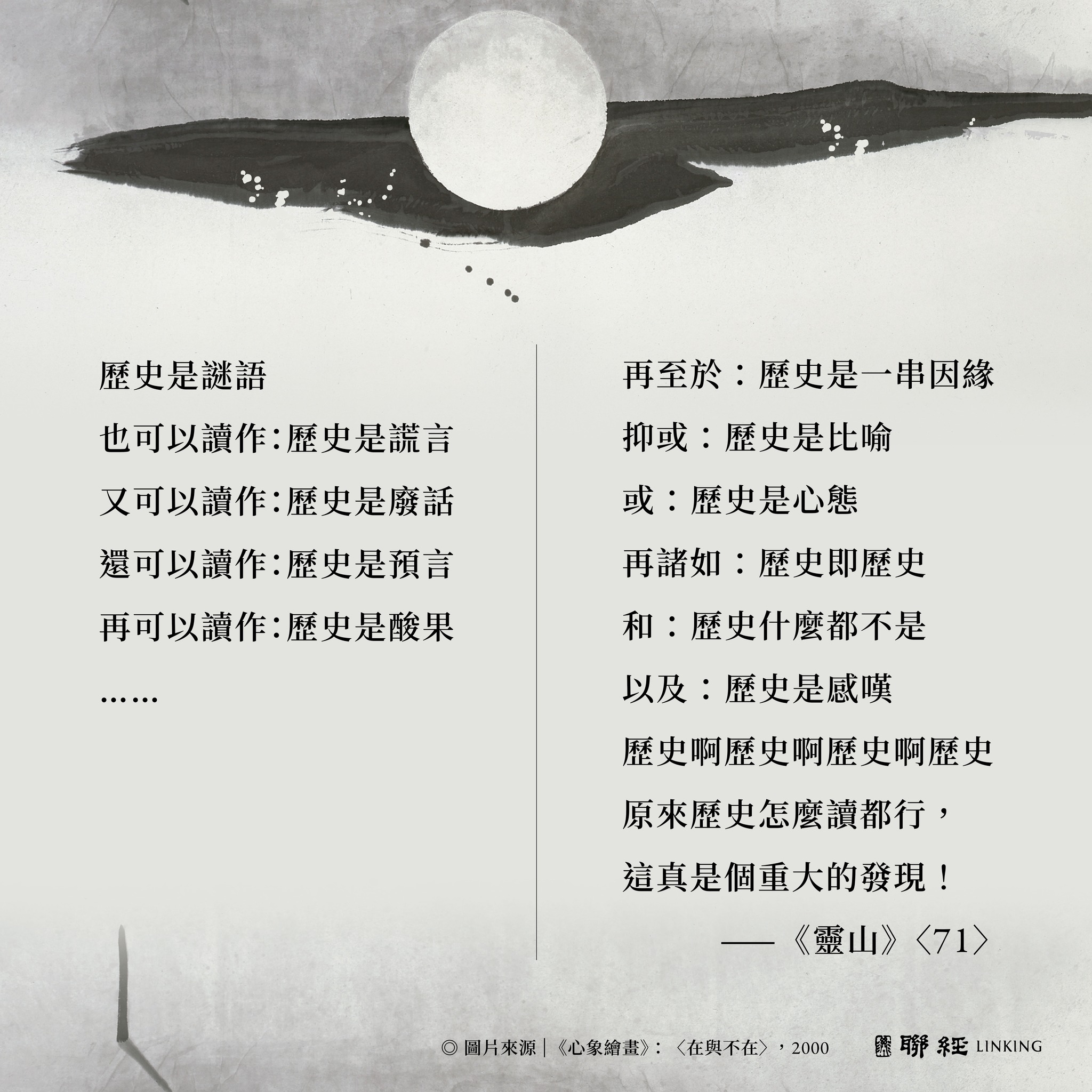 「文學並不只是對現實的模寫,它切入現實的表層,深深觸及到現實的底蘊;它揭開假象,又高高凌駕於日常的表象之上,以宏觀的視野來顯示事態的來龍去脈。」—— 高行健,諾貝爾文學獎得獎演說〈文學的理由〉